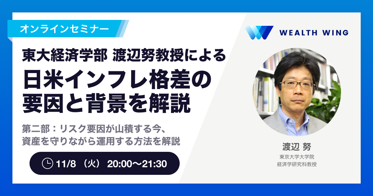 2022年10月時点、FRBによる利上げの影響で、米国や英国など多くの国の市場でインフレが起こっています。一方、日本では未だインフレ率は低水準となっています。本セミナーの第一部では東京大学経済学部 渡辺教授を迎え、米国と日本、それぞれのインフレの要因を探り、背景を解説します。第二部では、当社の展開する日本株おまかせ投資サービス『Wealth Wing』運用者の福田 雄一(ふくだ ゆういち)より、リスク要因が多分にあるなかで資産を守りながら運用する方法を解説します。