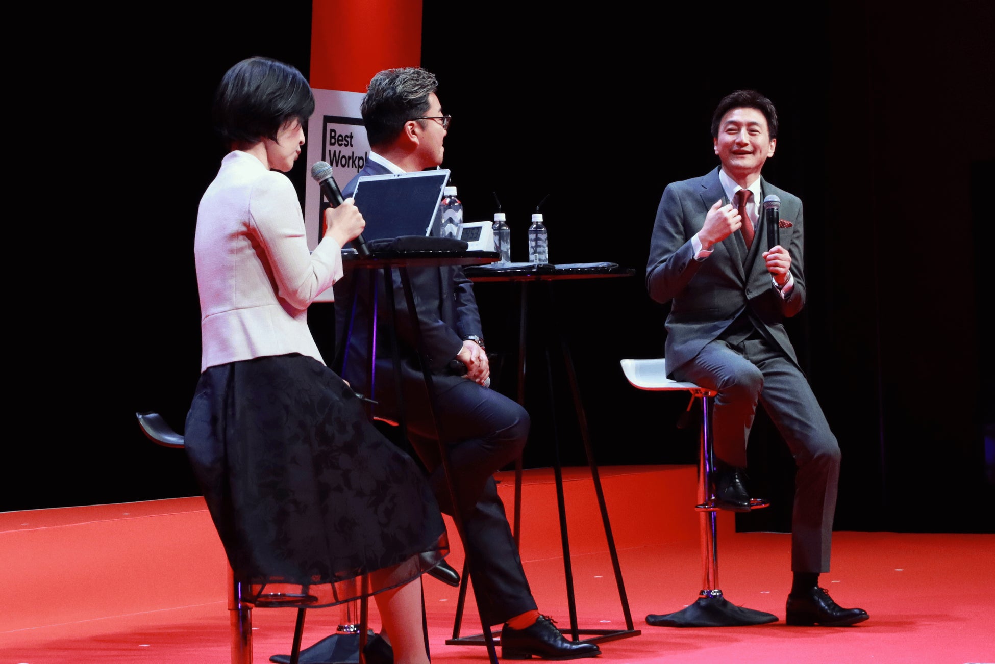また、同日に開催されたベスト100カンパニーの表彰式内のトークセッション「ワクワク楽しく働くための仕掛けとは?~日本企業において“仕事に行くことが楽しみである”の設問が低いのはなぜか~」のプログラムにファイブグループ執行役員の光藤が登壇し、ファイブグループの個人の理想と仕事を結びつけるステップアップの仕組みについてお話しさせていただきました。