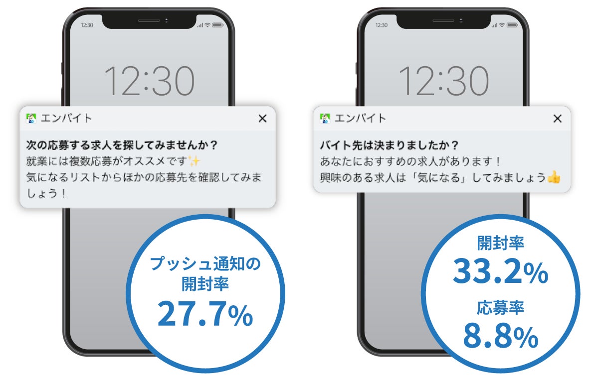すでに求人に応募したことがあり、初回起動から7日経過したユーザーを対象に複数応募を促すプッシュ通知を配信した結果、開封率は27.7%を記録。応募途中で離脱したユーザーを対象としたプッシュ通知では開封率33.2%、応募率8.8%という高い成果を実現しています。