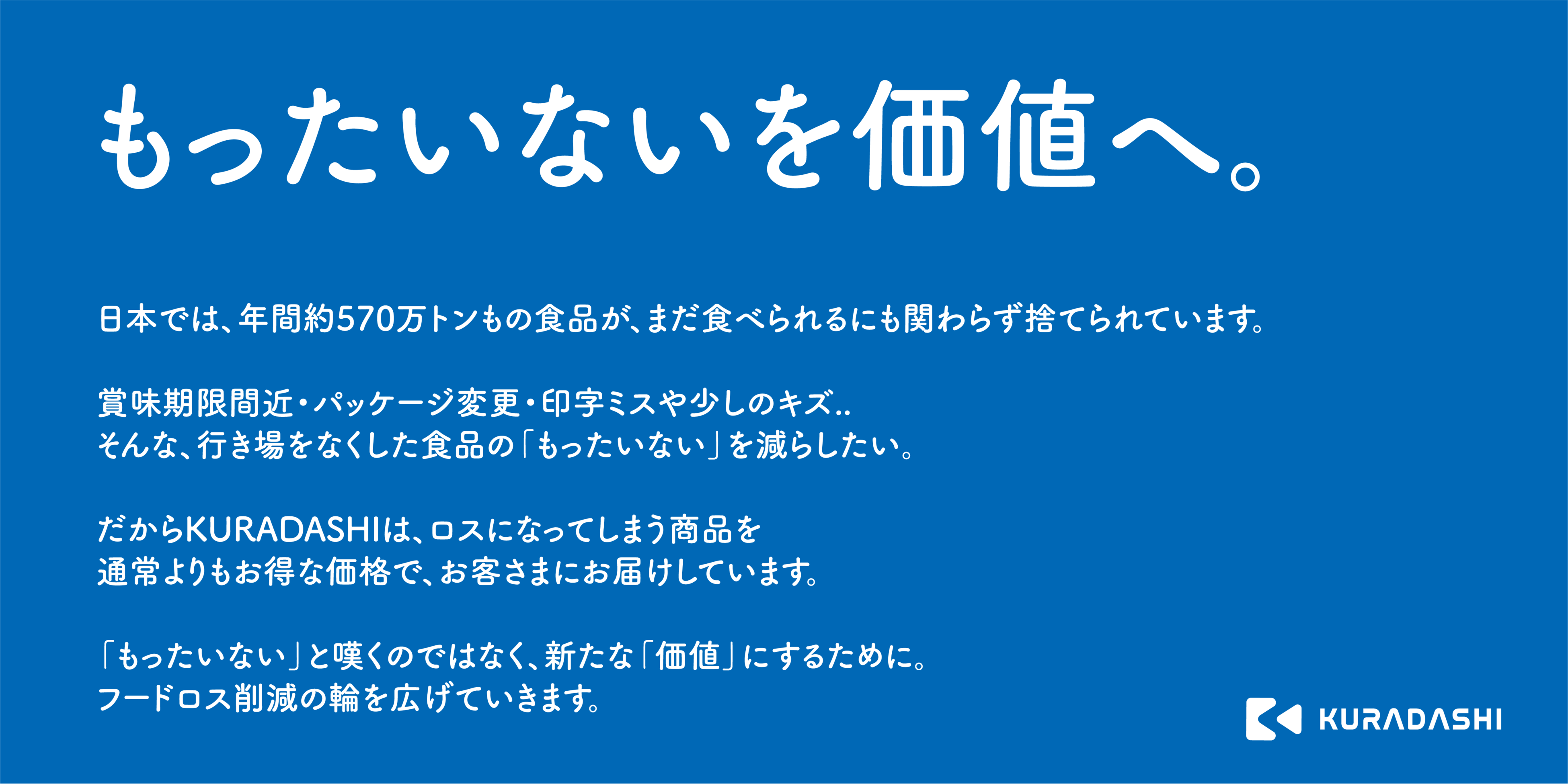 クラダシは、「日本で最もフードロスを削減する会社」をビジョンに掲げ、食品の賞味期限の切迫や季節商品、パッケージの汚れやキズ、自然災害による被害などの要因で、消費可能でありながら通常の流通ルートでの販売が困難な商品を買い取り、社会貢献型ショッピングサイト「KURADASHI」で販売することでフードロスの削減に取り組んでいます。