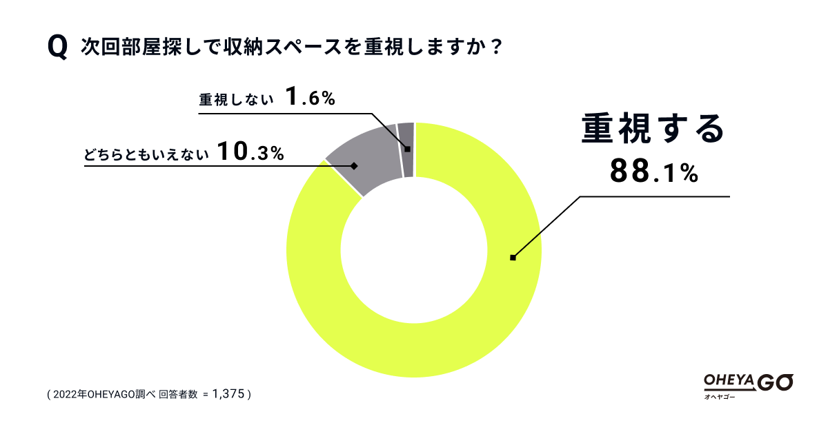 2022年1月に「OHEYAGO」が実施した「収納スペースに関する意識調査」で、部屋の収納スペース不⾜で購⼊を我慢しているものを質問したところ、最も多い回答は「⾐類」でした。また、88.1%の⼈が「次回の部屋探しで収納スペースを重視する」と回答(※1)しており、衣類などをしまう収納スペースはお部屋探しにとって大事なポイントの一つとなっていることがわかりました。