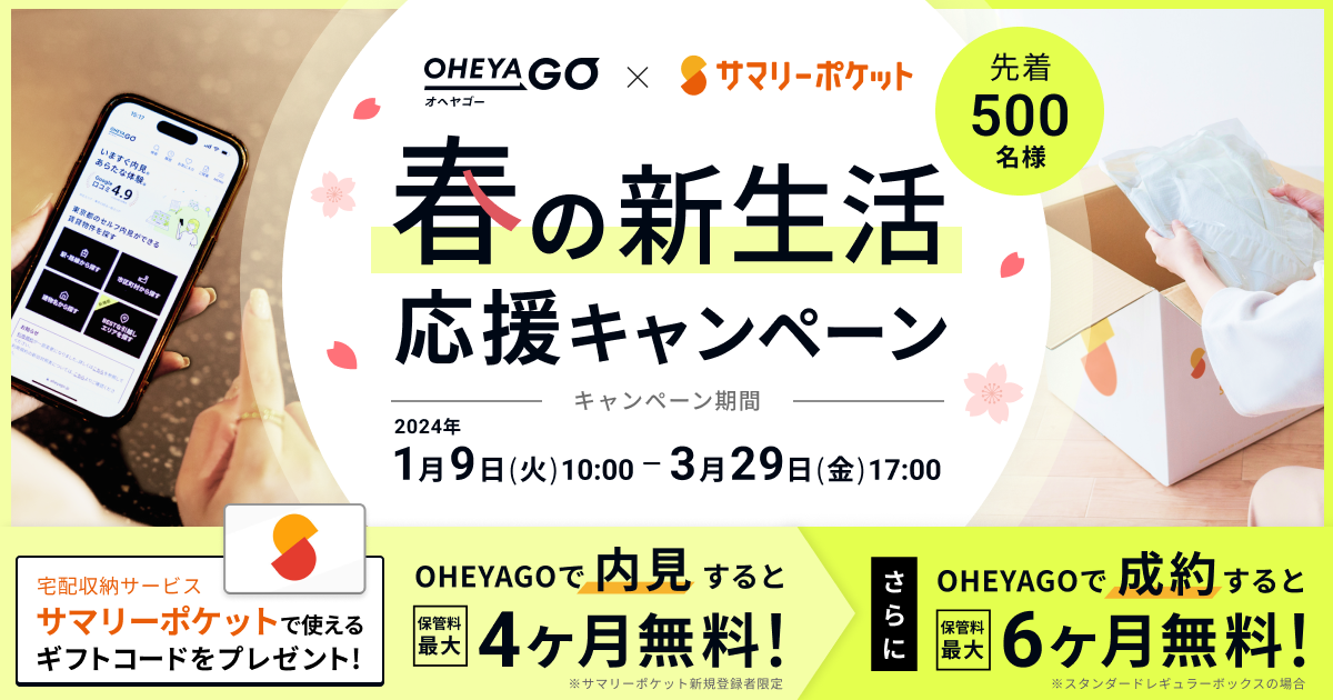 「OHEYAGO」で賃貸物件を内見いただいた方の中から、先着で500名様に「サマリーポケット」を最大4ヶ月間無料で使えるギフトコード1,600ポイント分(スタンダードプランレギュラーボックス1箱×4ヶ月間保管相当)をプレゼントいたします。