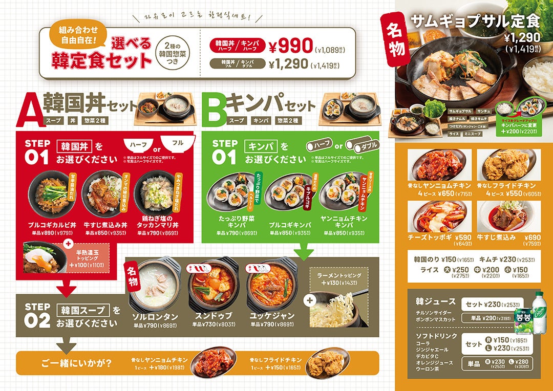 「韓国スープ」と「キンパ or 丼」を組み合わせて自分だけの韓定食をお楽しみいただけます。