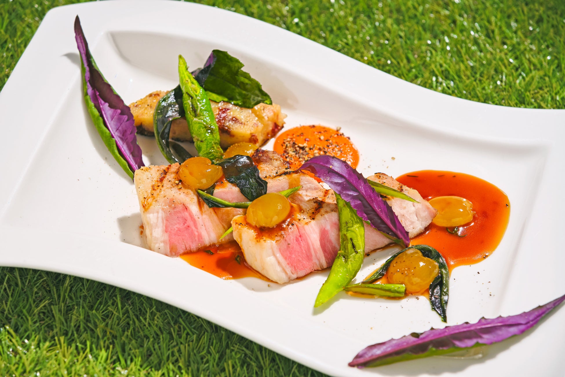 豚ロースのグリル セモリナケーキとハンダマのソテー サワーグレープソース