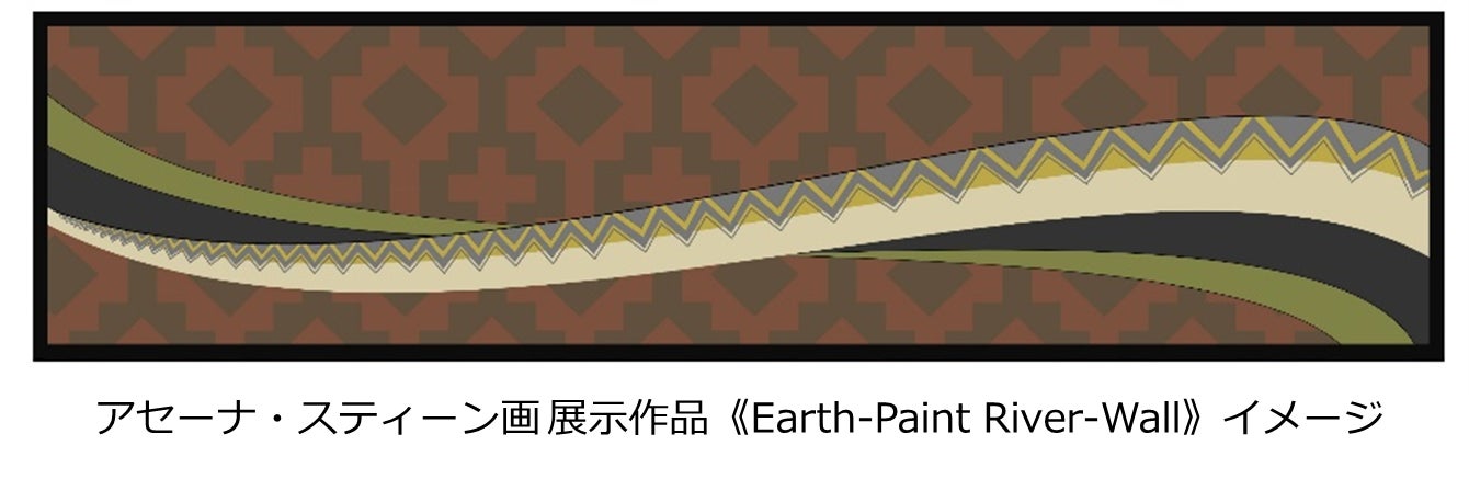 プエブロの陶器や織物、建物のデザインによく見られる階段状の山のデザインは、プエブロのコミュニティを囲む聖なる山を表現しています。4点が東西南北に対応する菱形は地球を表し、すべての方向が収束する場所が中心となります。背景の模様は、物理的、空間的な要素を組み合わせ、人と自然との相互関係を体現しています。二連の川が横断して流れる手前には、雨と雲を象徴する三角の束が、生命を育む水の本質的なパワーとエネルギーによって流れています。もう一本は、その下で守られた、まだ見ぬ創造的な精神の流れで、ここにワークショップ参加者が土絵具を用いて自由に色をつけていきます。