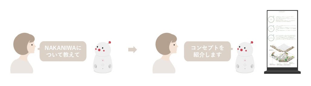 来場者がロボットに話しかけた内容を基に、生成AIを活用して自動生成した回答をロボットが発話し、関連する動画等のコンテンツをサイネージ画面に表示することにより、来場者固有の関心事に合った情報をインタラクティブに楽しくお届けします。「NAKANIWA」では、同施設のコンセプトや同社グループが推進する不動産開発プロジェクトの紹介、近隣のランチ店舗などの情報から提供を開始する予定です。