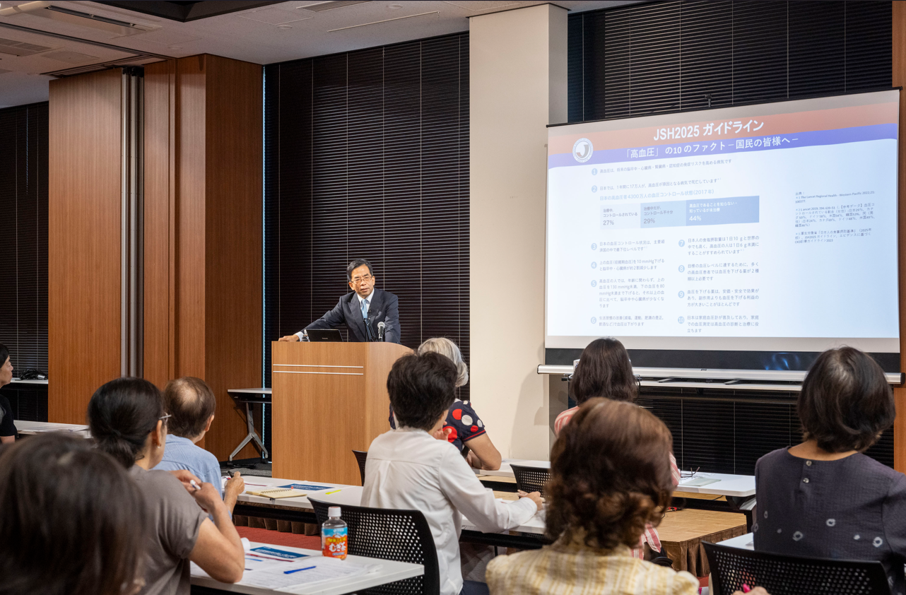 日本高血圧学会理事長・自治医科大学 循環器内科学部門教授の苅尾七臣氏が、高血圧治療の最新情報や薬との付き合い方をわかりやすく解説。血圧に良い生活習慣や血圧測定の重要性について分かりやすく教えていただきました。また、忙しい方や膝が悪い方のための簡単な運動法もレクチャーしていただき、参加者の皆さまも一様に注目しておりました。
