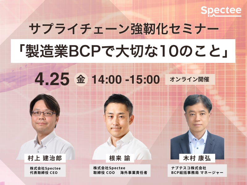 防災テックスタートアップの株式会社Spectee(東京都千代田区、代表取締役:村上建治郎、読み:スペクティ、以下Spectee)は、 2025年4月25日(金)に、サプライチェーン強靭化をテーマにしたオンラインセミナー「製造業BCPで大切な10のこと」を開催します。