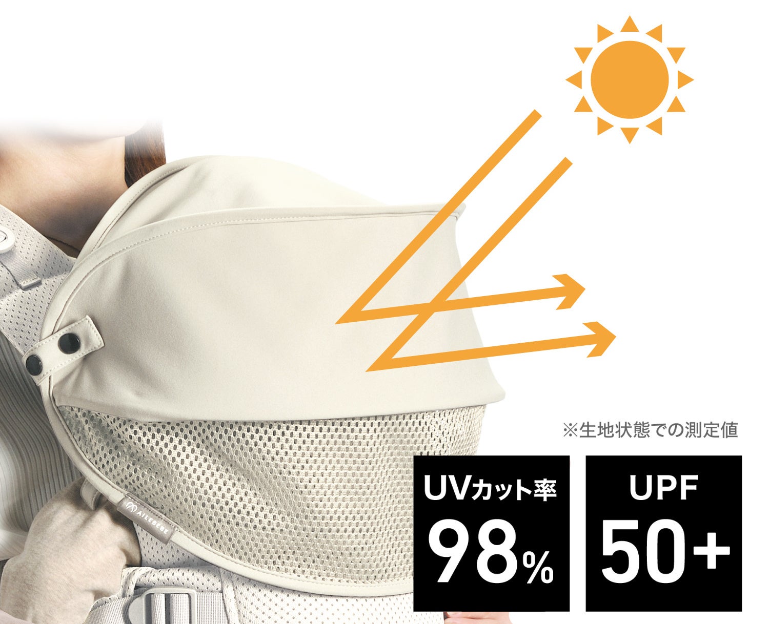 UVカット率98%、UPF50+※の生地を採用で、強い日差しから赤ちゃんを守ります。
