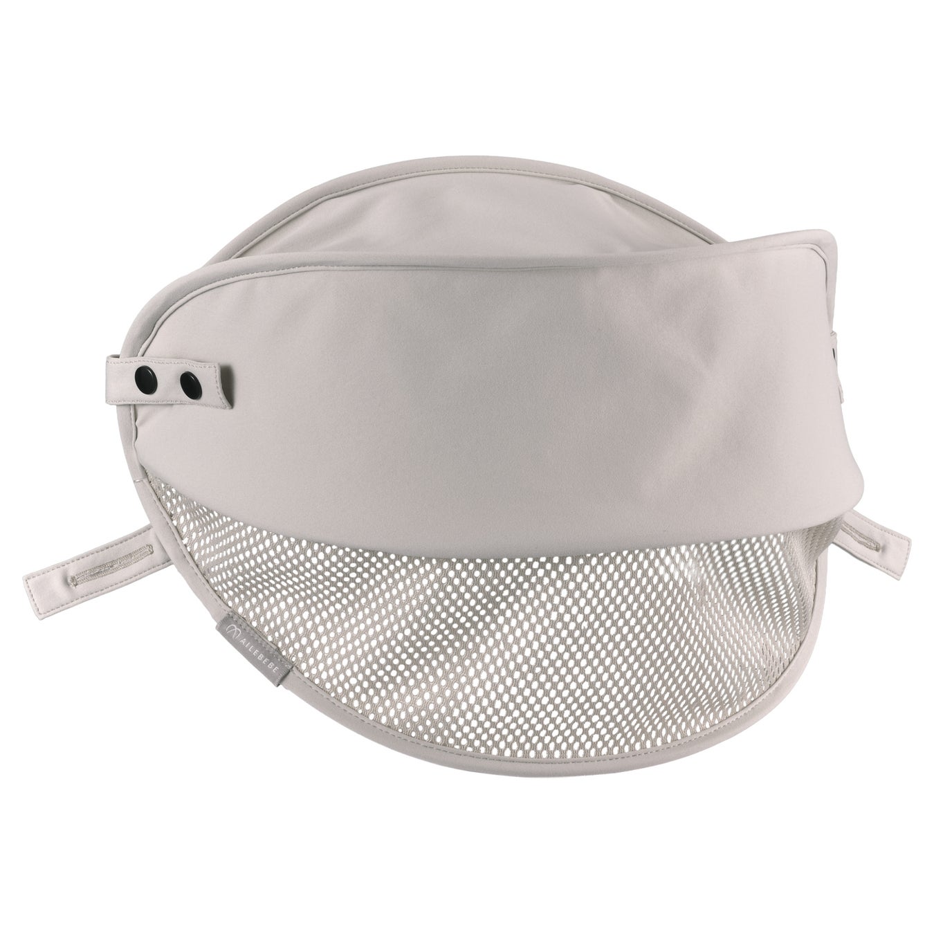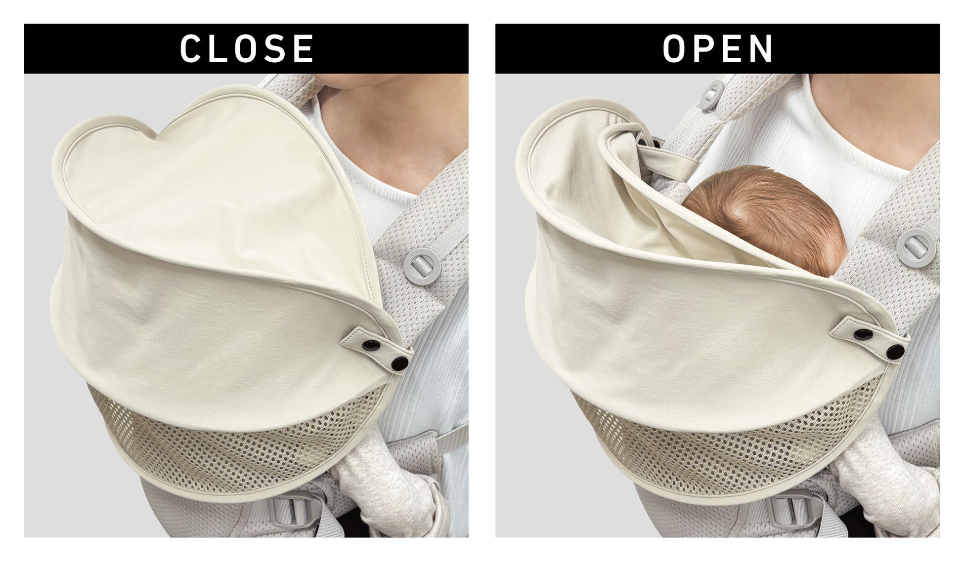 従来の抱っこひも用ケープや付属のフードは、使用すると赤ちゃんの頭に密着しやすく、蒸れることがありました。そこで、赤ちゃんの頭まわりに空間を持たせて風通しを良くする、立体構造のサンシェードを開発(特許出願済み)。試作を繰り返す中で、他にはない独特の形状が生まれました。これにより広い日陰を作り、メッシュ生地が風を通します。これからの季節でも赤ちゃんが快適に過ごせる仕様となっています。