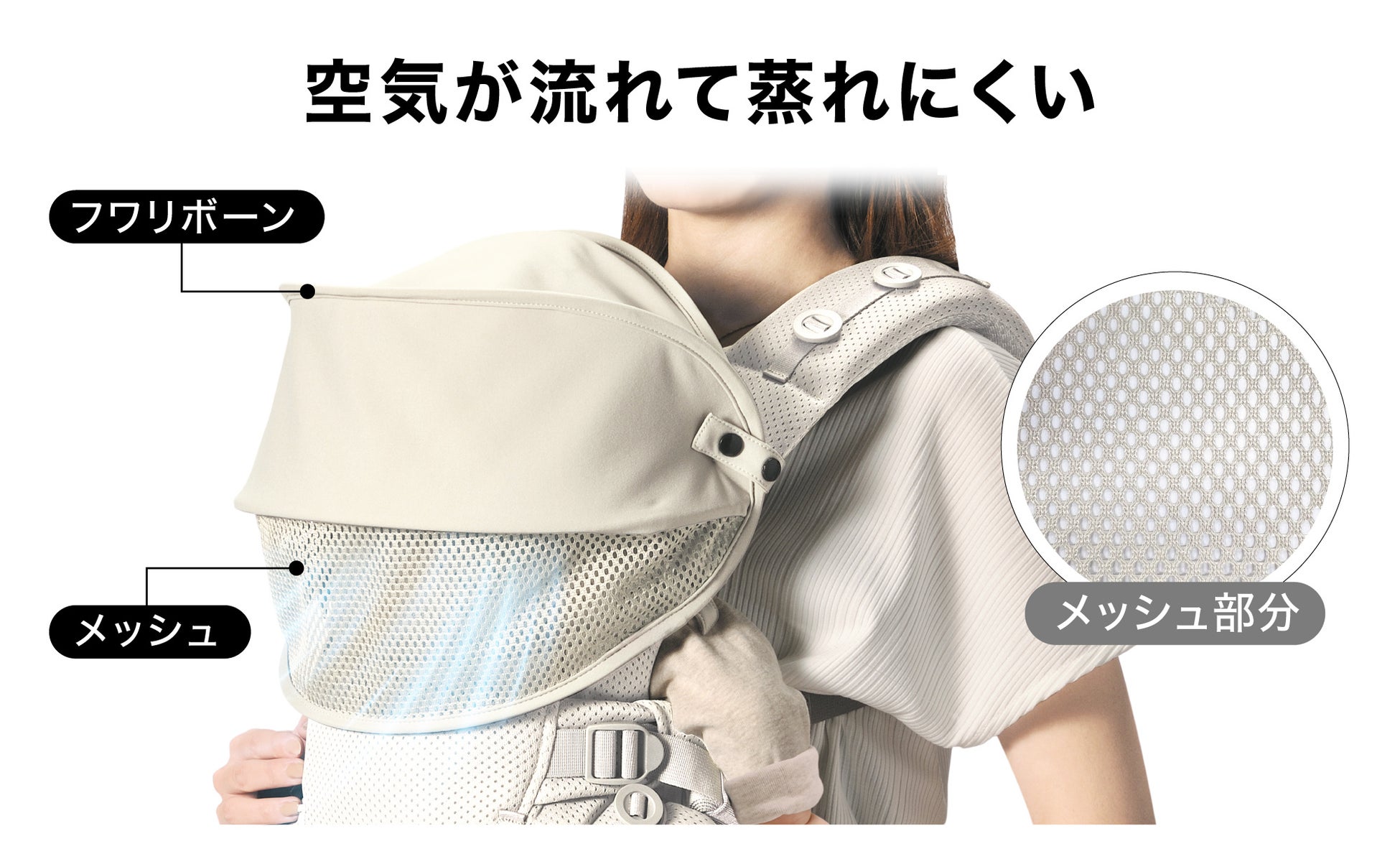 柔らかくて壊れにくい骨組み「フワリボーン」を採用。ふわりと赤ちゃんを守るような形状で日陰を作ります(特許出願済み)。また、「エールベベ・ベビーキャリア スリー」で実績のある通気性の高いメッシュ生地を採用し、暑い季節も蒸れにくい設計です。
