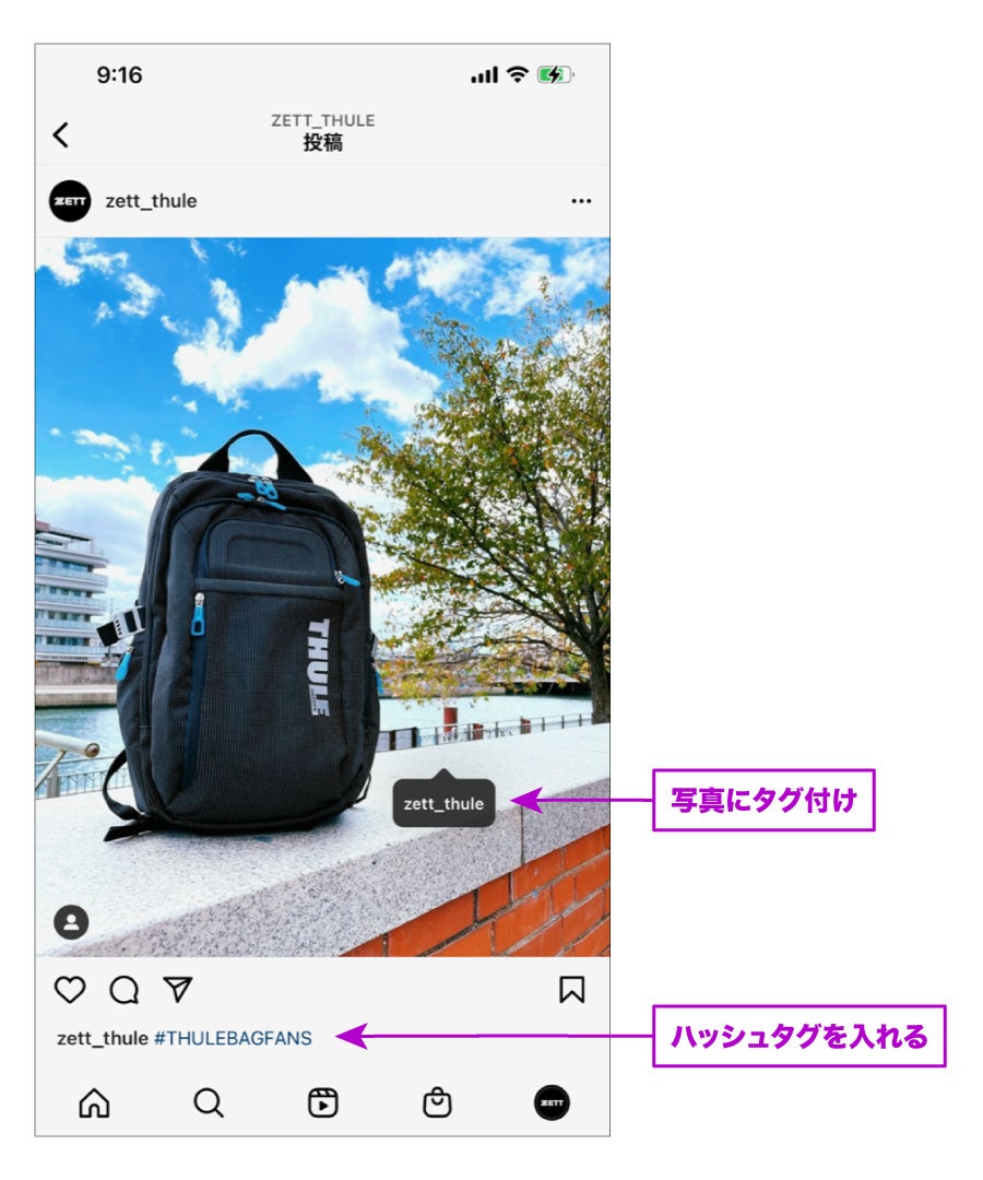 ②お持ちのTHULE BAGを撮影した写真に、ハッシュタグ 【#THULEBAGFANS】と【@zett_thule】のタグを付けて投稿してください。ハッシュタグは、大文字小文字どちらでもOKです。半角でご入力ください。