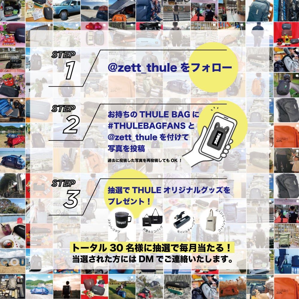 ゼット株式会社(本社/⼤阪市天王寺区、代表取締役社⻑/渡辺裕之)が取り扱うスウェーデンのブランド『THULE』(スーリー)の公式インスタグラムアカウント(https://www.instagram.com/zett_thule/)にて、2022年6⽉8⽇(⽔)から2022年9⽉30⽇(⾦)の期間中、お持ちのTHULE BAGの写真にハッシュタグ【#THULEBAGFANS】と【@zett_thule】のタグを付けて投稿していただいた方の中から毎⽉抽選でTHULEオリジナルグッズ(⾮売品)をプレゼントするキャンペーンを実施中です。