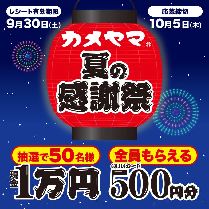 【応募規約】●必要事項に不備や虚偽がある場合や、切手の貼付がないもの、所定の切手料金に満たないものは無効となります。●レシートに購入日、対象商品名、金額、店名が確認できない場合は無効となります。●住所や転居先が不明、郵便事故等の理由により賞品をお届けできない場合は無効とさせていただきます。●クレジットカードでのお買い上げの場合は、レシートのカード情報を切り取り、お買い上げ情報が記載された部分のみ封入、または貼付してください。●ご応募いただいたものは全て返却できません。●ご応募ならびに賞品の発送は日本国内に限らせていただきます。●ご応募物の配送事故等による紛失に関して、カメヤマでは責任を負いかねます。●ご応募の内容に応じては、事務局よりご連絡させていただく場合がございます。●応募期間が過ぎても店頭にてキャンペーン告知がされている場合がありますが、レシート有効期間外のご応募は無効となります。●15歳未満の方は保護者の同意を得た上でご応募ください。●無効の場合のご連絡はいたしません。