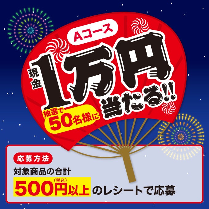 【応募方法】対象商品をお買い上げいただいた際のレシート(購入日、対象商品名、金額、店名の記載があるもの)合計金額【Aコース】500円分(税込)以上、【Bコース】2,500円分(税込)以上を1口(レシートの金額は複数枚の合算可、複数店舗でのご購入の合算可)とし、専用応募封筒、または市販の封筒に封入、もしくはハガキに貼付し、必要事項(①ご住所②お名前(フリガナ)③電話番号④年齢⑤お買い上げ店舗名⑥ご希望のコース)を明記の上ご応募ください。