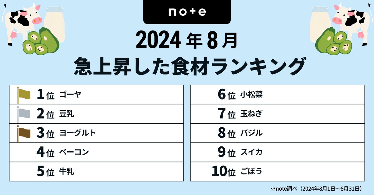 2024年8月に、noteへのレシピ投稿数が急上昇した食材のランキングを発表します。上位には、ゴーヤや豆乳、乳製品がランクインしました。それぞれの食材を使ったレシピもご紹介します。