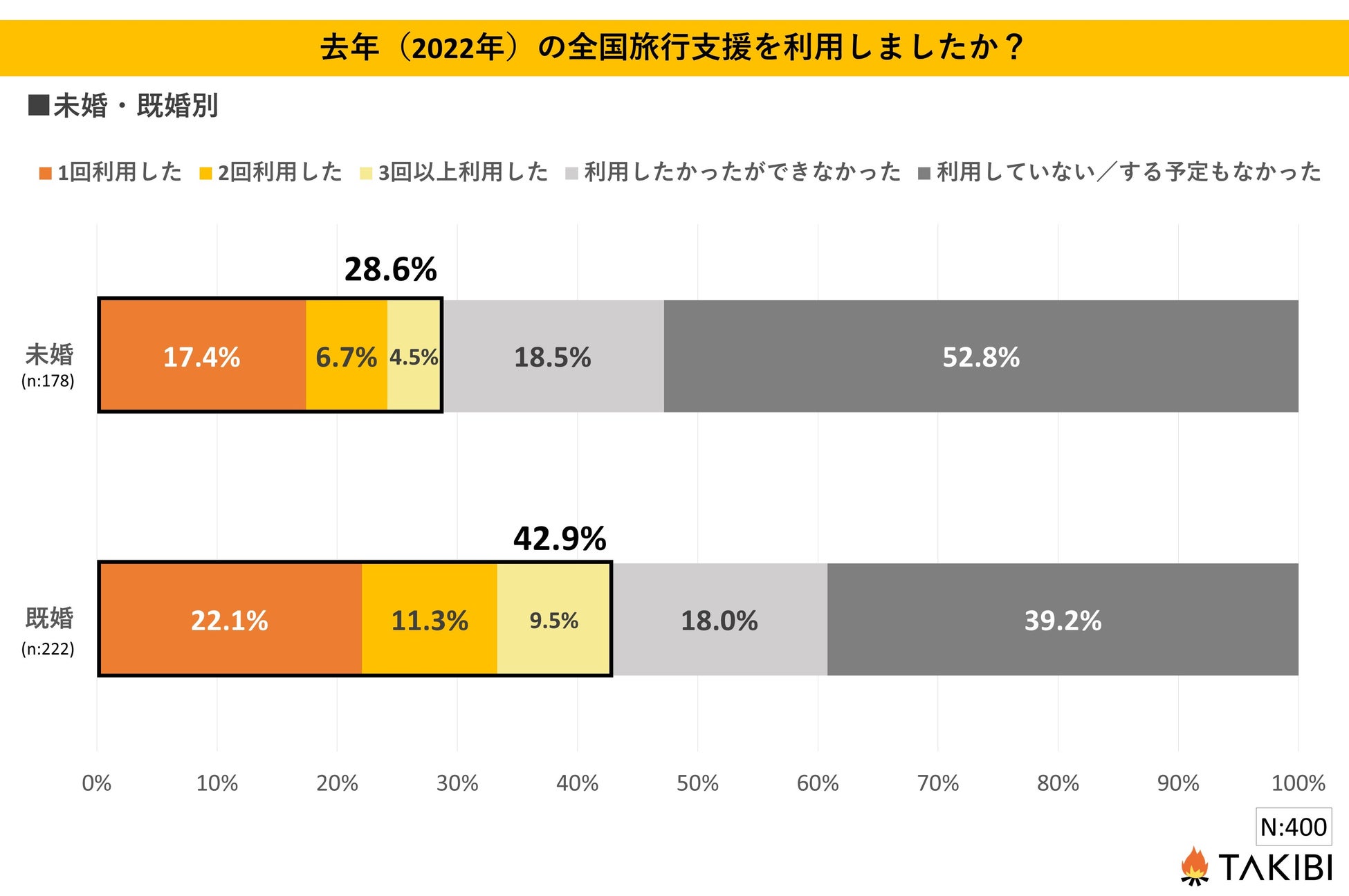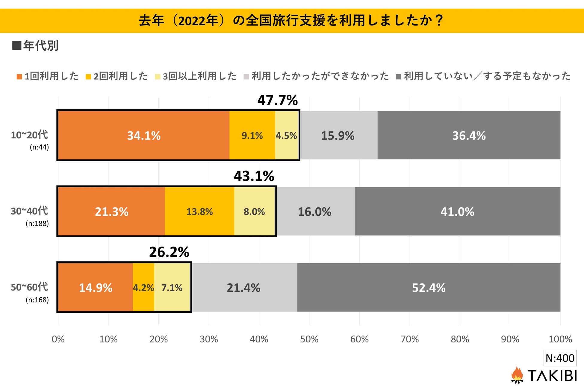 キャンプやグランピングを中心としたアウトドア総合情報サイト「TAKIBI」の運営をおこなう株式会社フォーイットは、全国の10代~60代までの男女400人を対象に全国旅行支援の利用に関するアンケートを実施し、年代別・未婚/既婚別等の特徴についてまとめました。