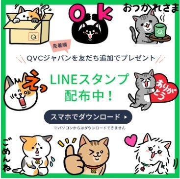 【使用期間】ダウンロード後90日間 ※先着順でプレゼント。QVC公式サイト(https://qvc.jp)のインフォメーション内QVCオリジナルLINEスタンプの告知画像からダウンロードページに遷移します。