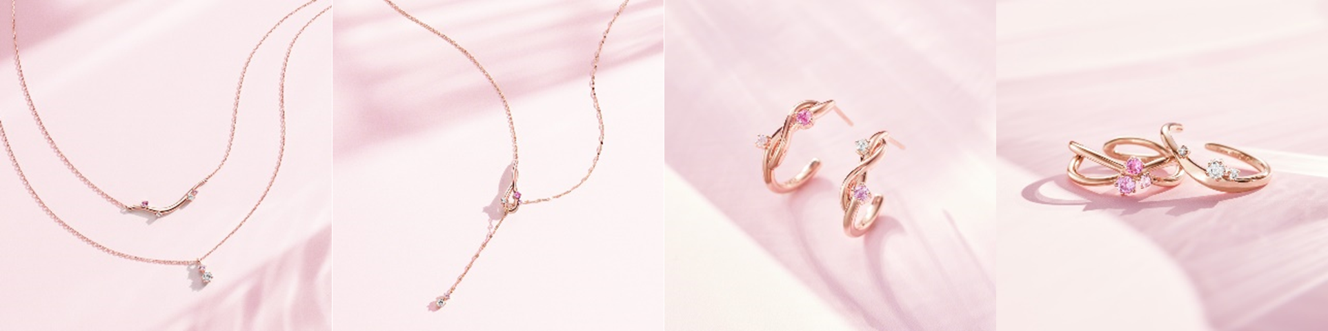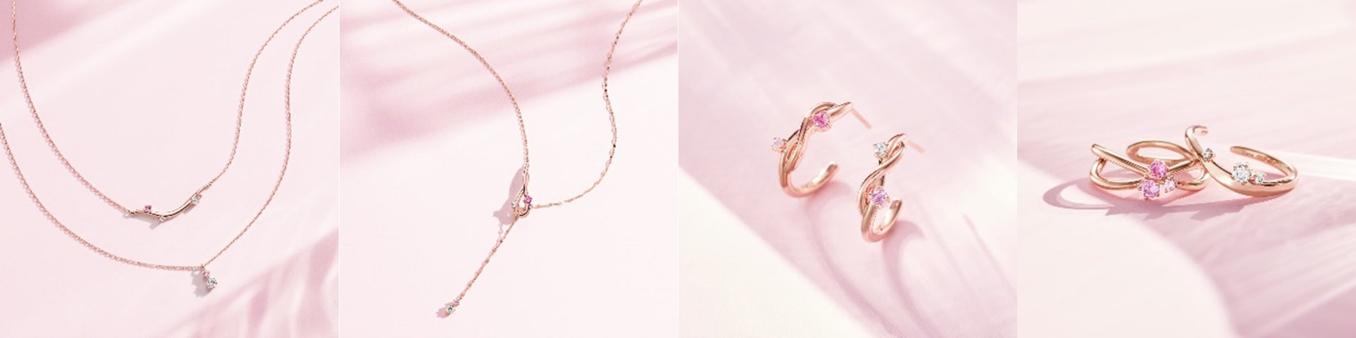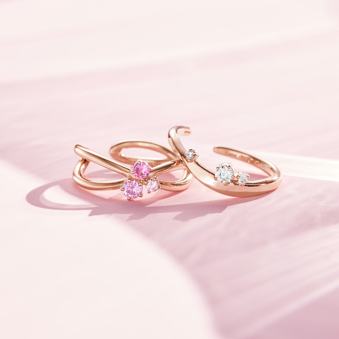 煌めくピンクカラーのストーンでいちごのかき氷をイメージしたジュエリーも登場。やわらかいピンクゴールドの地金のラインで、口の中にやさしく広がるいちごの甘さや夏の日差しで溶けるかき氷を表現しました。スプーンからこぼれ落ちるかき氷のようなラインのラリエットネックレスや、ストーンを散りばめ、かき氷の涼やかな輝きを表現したリングカフセットの重ね着けで、あなただけのコーディネートを見つけて。