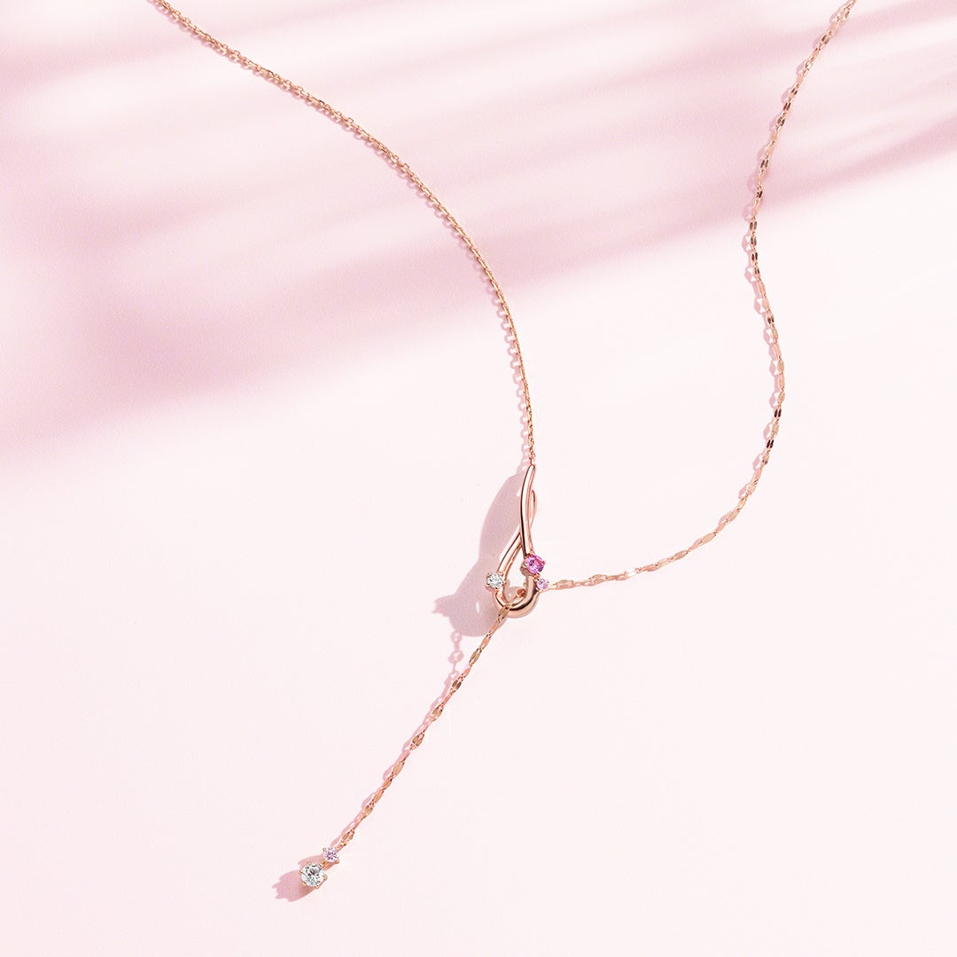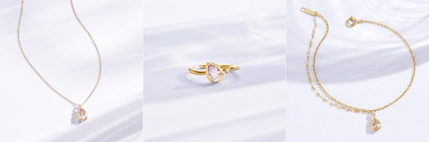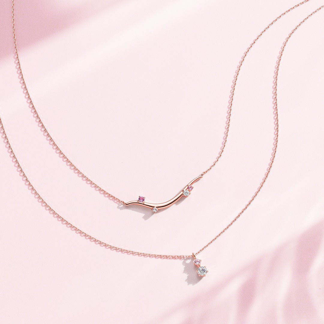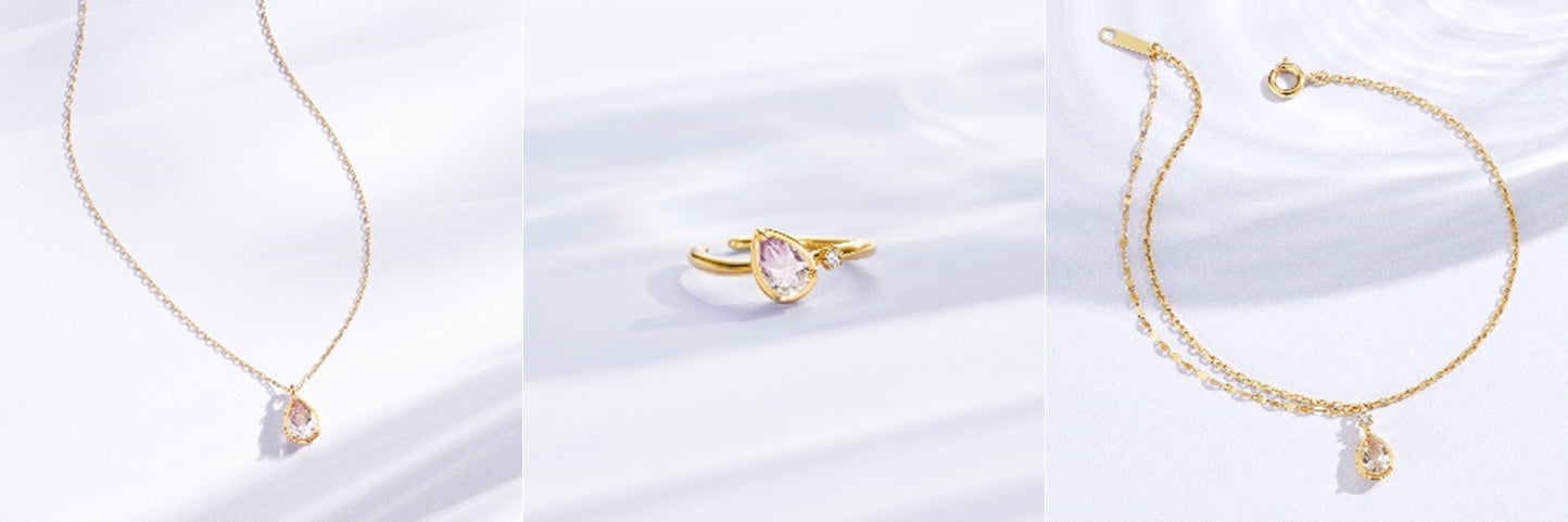 煌めくピンクカラーのストーンでいちごのかき氷をイメージしたジュエリーも登場。やわらかいピンクゴールドの地金のラインで、口の中にやさしく広がるいちごの甘さや夏の日差しで溶けるかき氷を表現しました。スプーンからこぼれ落ちるかき氷のようなラインのラリエットネックレスや、ストーンを散りばめ、かき氷の涼やかな輝きを表現したリングカフセットの重ね着けで、あなただけのコーディネートを見つけて。