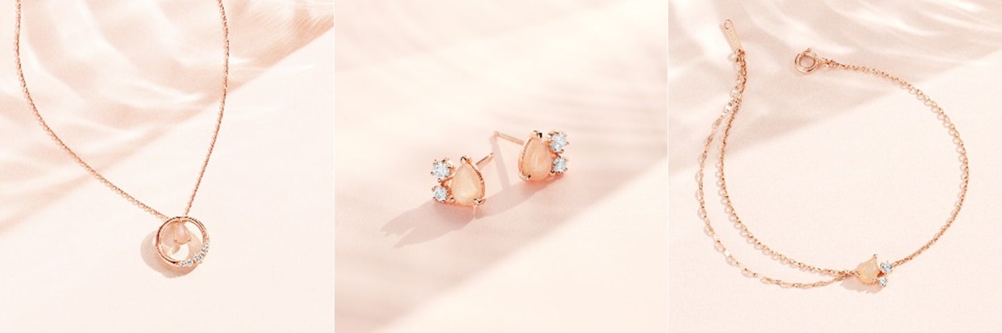 ピンクオレンジカラーのピーチムーンストーンに、繊細に輝くストーンを添えることでフレッシュな桃のパンナコッタを表現したシリーズ。パンナコッタのなめらかな口当たりを思わせるような、つるんとしたカボションカットが目を惹きます。初夏のシンプルなコーディネートに、ピュアで可憐な輝きを添えてみては。
