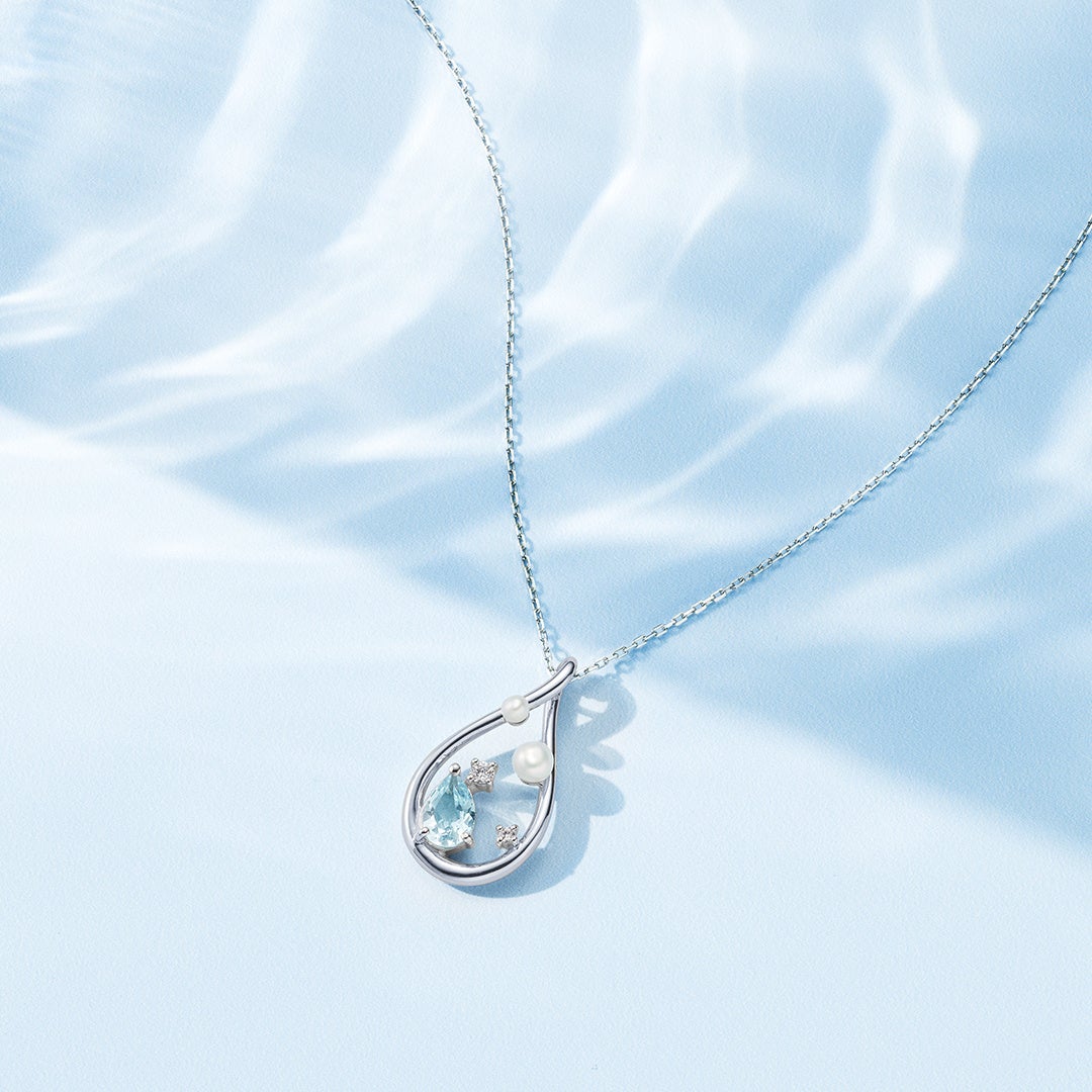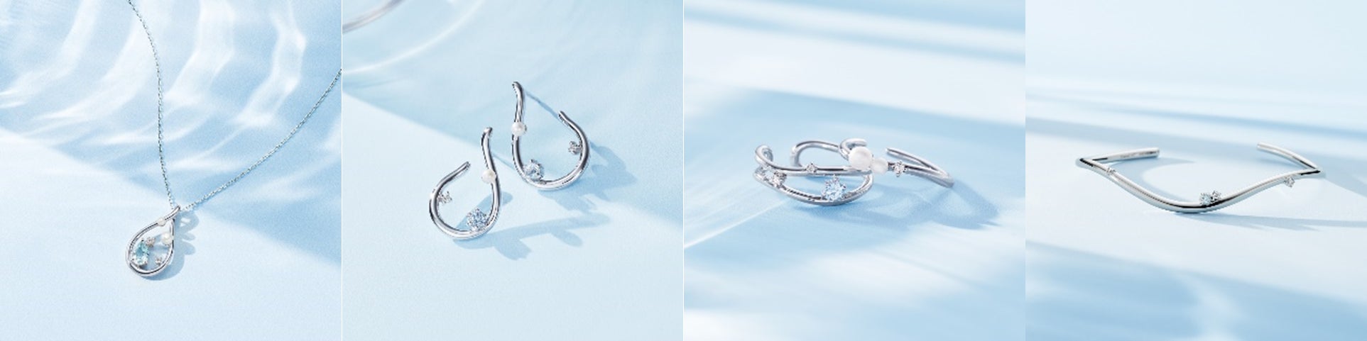 透き通る水色が爽やかなスカイブルートパーズをあしらい、どこか懐かしさを感じる喫茶店のクリームソーダをイメージしたシリーズ。ランダムに散りばめたストーンやパールが、パチパチと弾ける炭酸と甘くとろけるアイスクリームを思わせるデザインに。クリームソーダのグラスを象ったなめらかな地金のラインが、胸元や耳元を涼やかに彩ります。