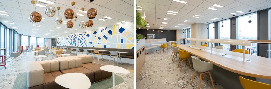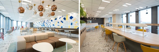 約100席ある休憩室は、2面ガラス張りで開放的な空間の中に「人を意識する」フリースペースを中央に設け、ラウンジのように落ち着ける「自分だけの時間をつくる」カウンター席や、テーブル席、眺望を楽しむソファ席の差し色で明るさを取入れ、従業員がリラックスして休憩したり、コミュニケーションを活性化できる環境を整えています。