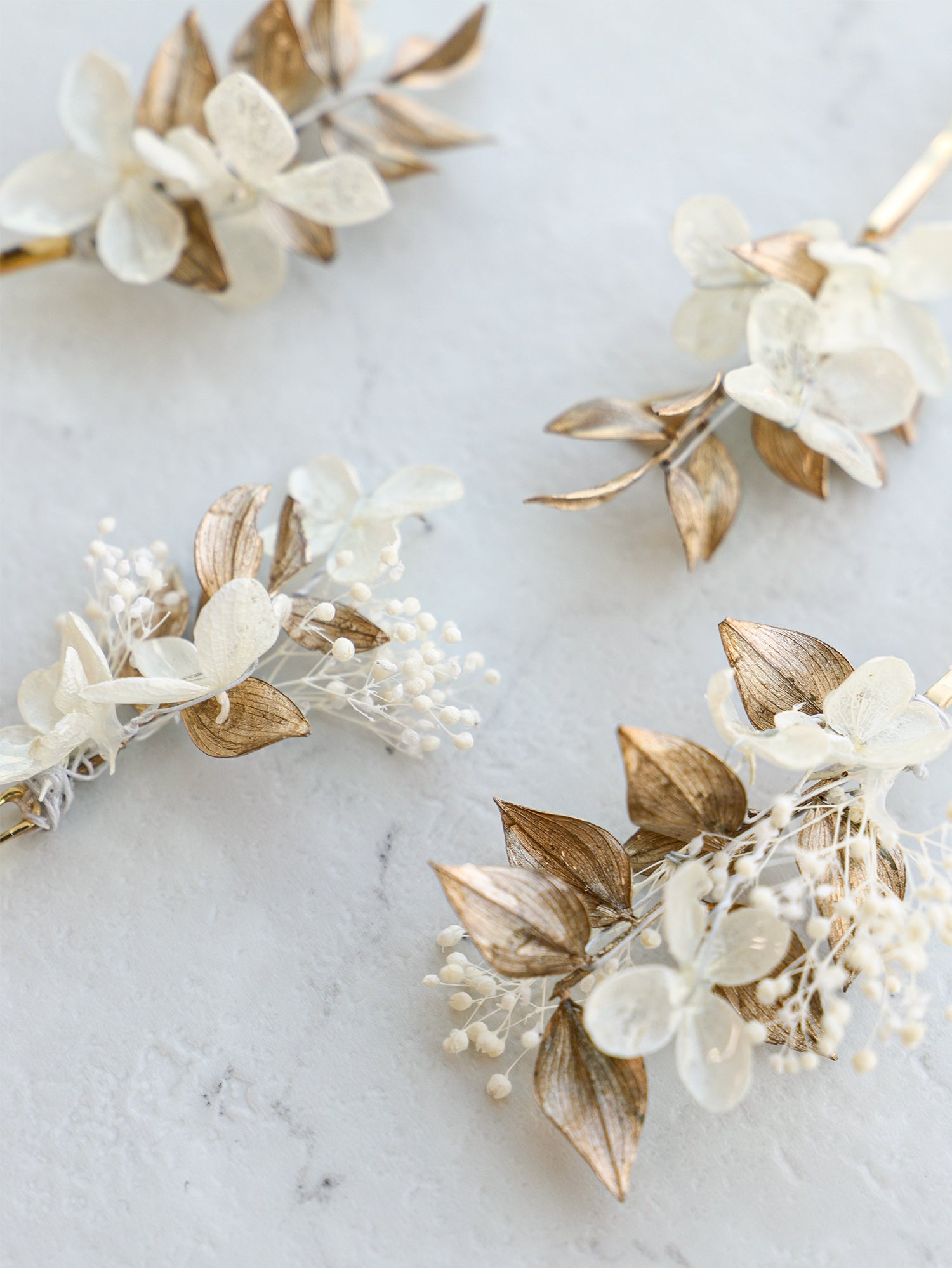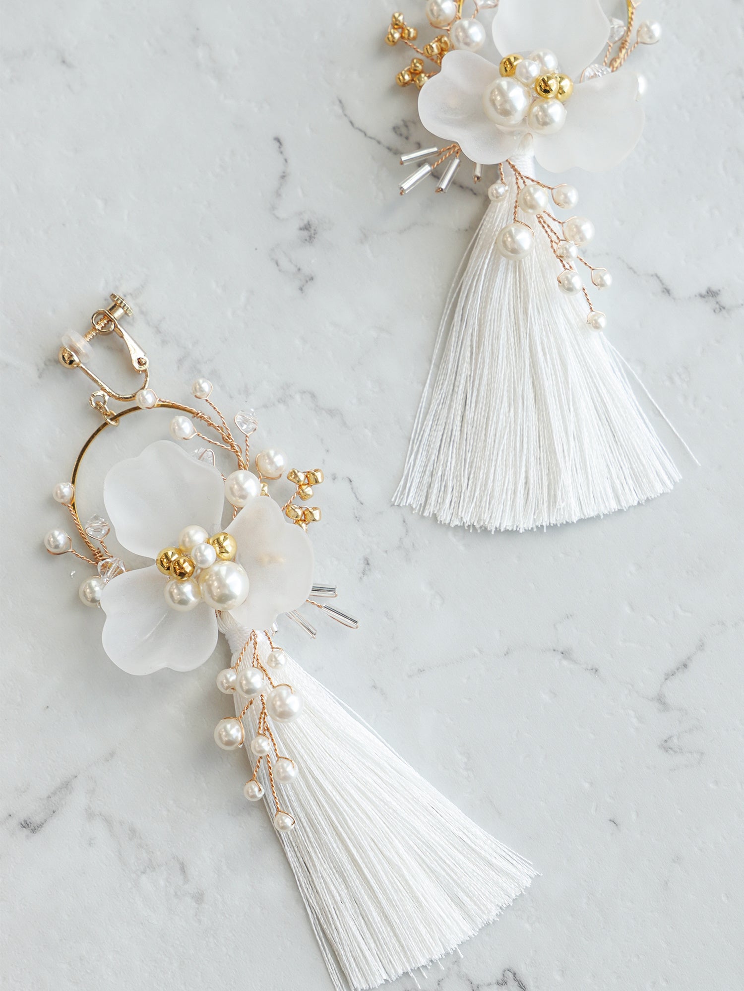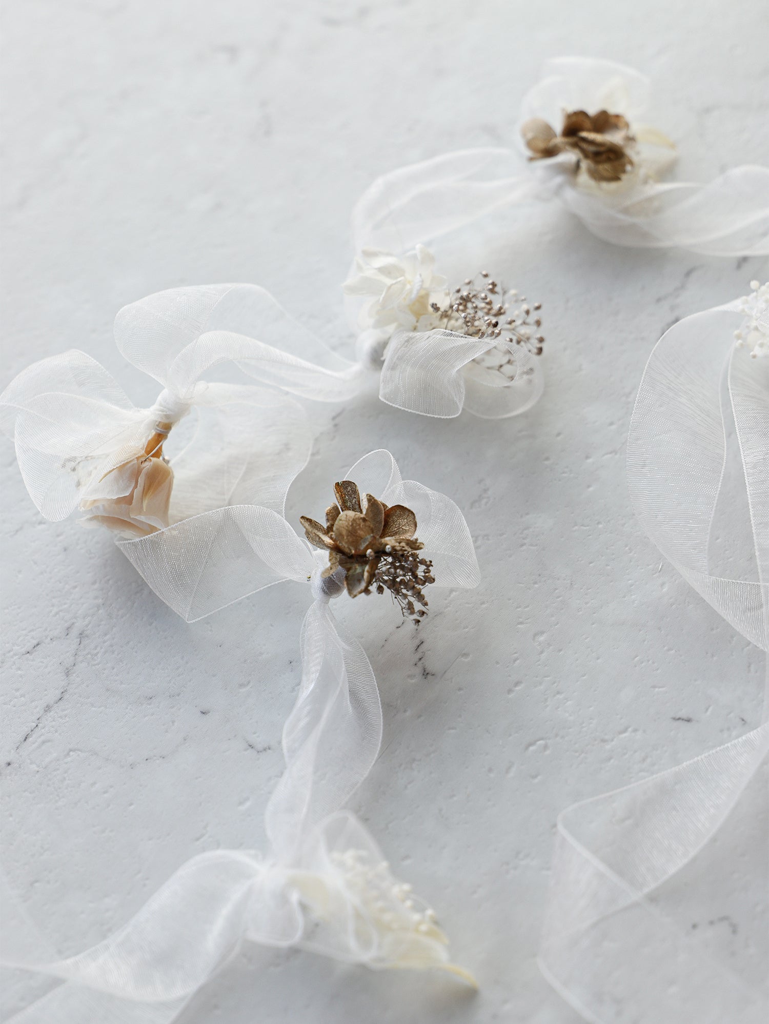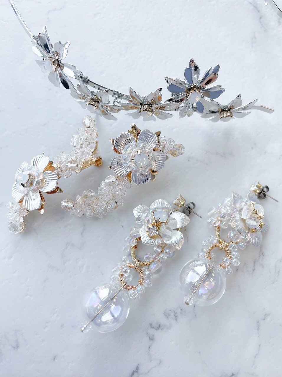 アシメントリーなお花がワンポイントのイヤーアクセサリーFlowing flowerと、まあるいフォルムが愛らしい透明感たっぷりなイヤーアクセサリーBubble flowers。そして、ヘルシーなデザインがドレスや他の小物を邪魔しないシンプルで使いやすいデザインのカチューシャNatural flower headbandを制作。