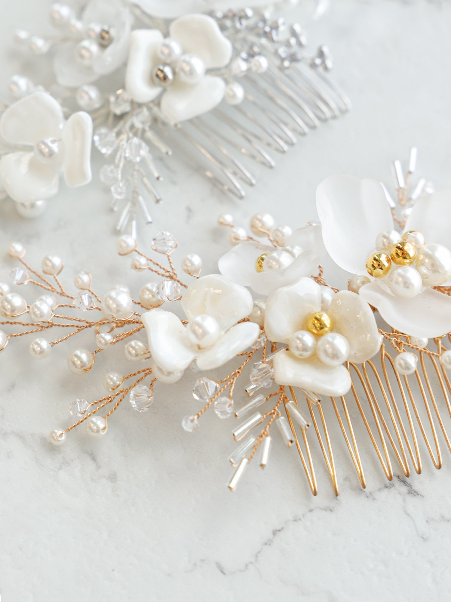 存在感のあるブライダルベールのお花の周りにパールやビーズが繊細に美しく散りばめられたデザイン。 花嫁様がつけたときに1番美しく見えるよう、ワイヤーの曲線、ビーズ1ミリの配置にもこだわり制作しています。 ワイヤーは柔らかいので好みのかたちにご自身で変形することも可能です。