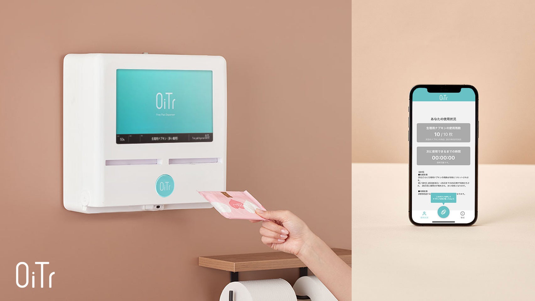 「OiTr」は、商業施設・オフィス・学校・公共施設などの個室トイレに、 生理用ナプキンを常備し無料で提供するサービスです。女性が強いられるさまざまな負担を軽減し、「トイレットペーパー同様、トイレに生理用品が常備される社会」の実現に向けサービスを展開しています。オイテルはこれまで、百貨店や量販店等の商業施設や、オフィス、学校などの施設への導入や実証実験の実施をすすめています。