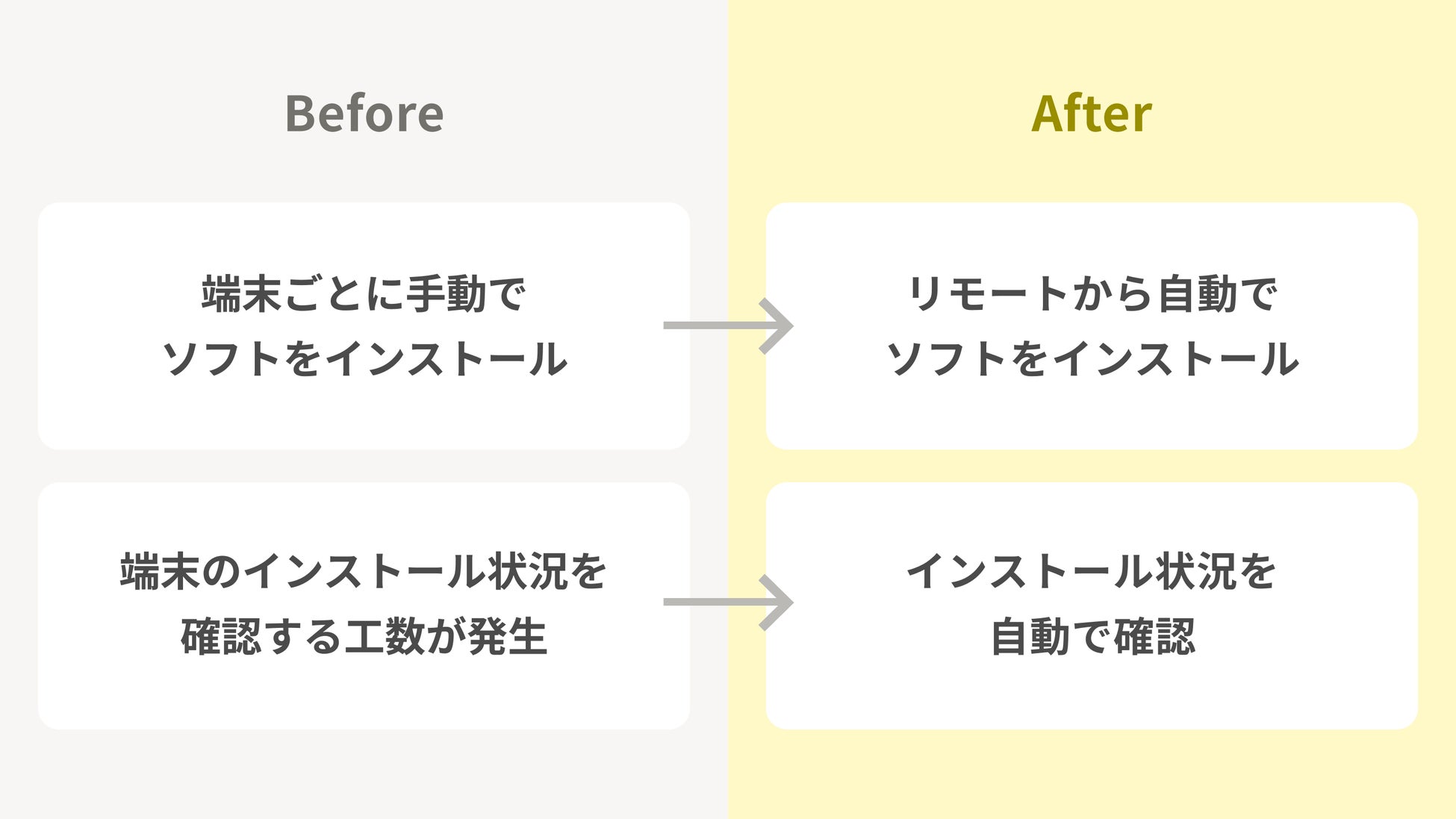 ソフトウェア配布機能を活用することで、各端末に対するソフトウェア配布が効率化され、IT管理者の業務負担が大幅に軽減されます。セキュリティリスクを減らし、ライセンス管理も強化でき、運用の透明性が向上します。