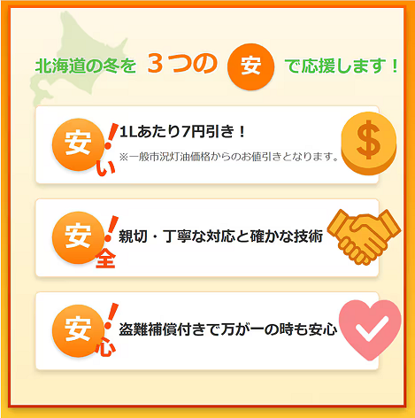 「リロの宅配灯油」は、北海道の冬を3つの「安」で、北海道の冬を応援します。