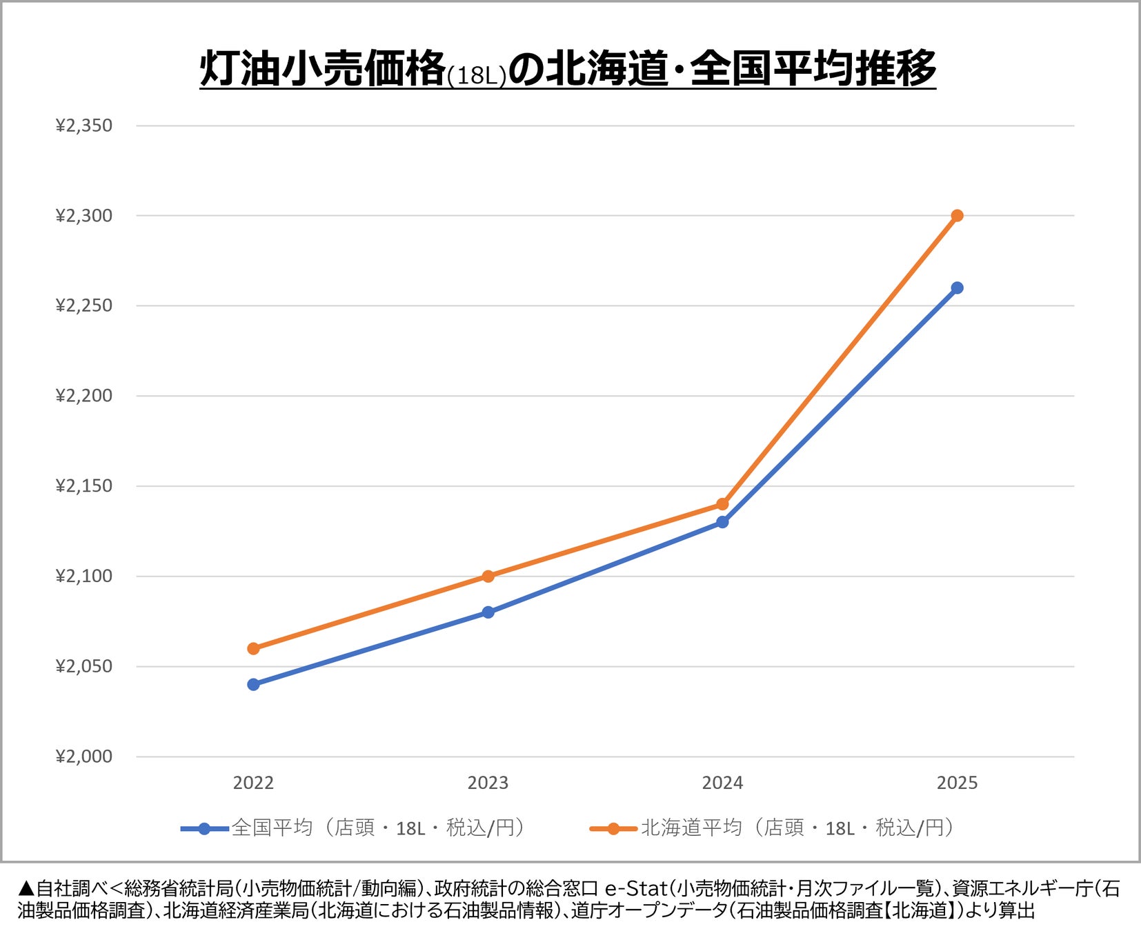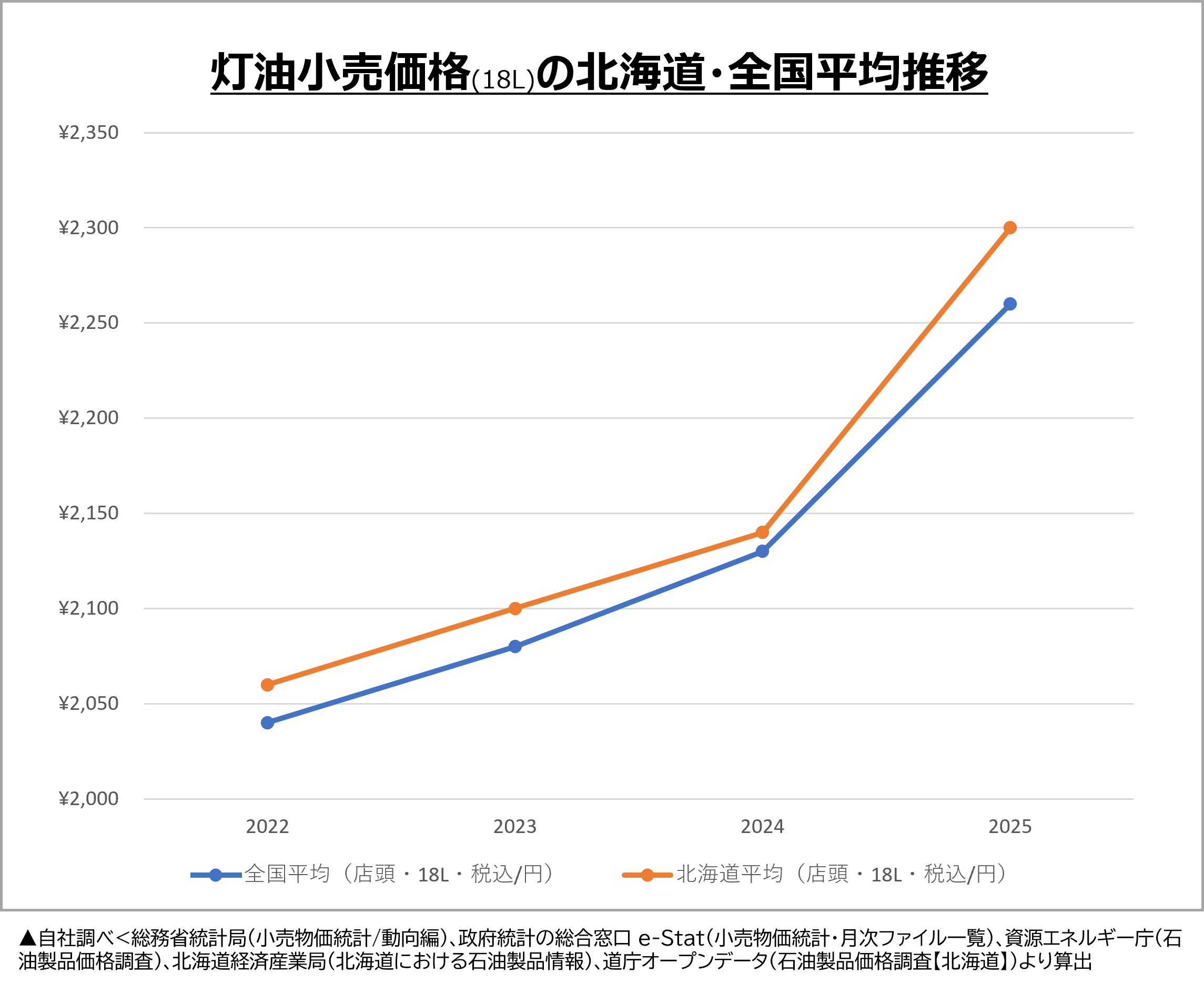 加えて「北海道と全国平均の灯油価格推移比較グラフ」*3 が示すとおり、北海道における灯油価格は寒冷地特有の暖房需要の高さや物流コストの上昇などを背景に、全国平均を上回る水準で推移しており、生活に欠かせない暖房費が道民の暮らしに継続的な負担を与えています。