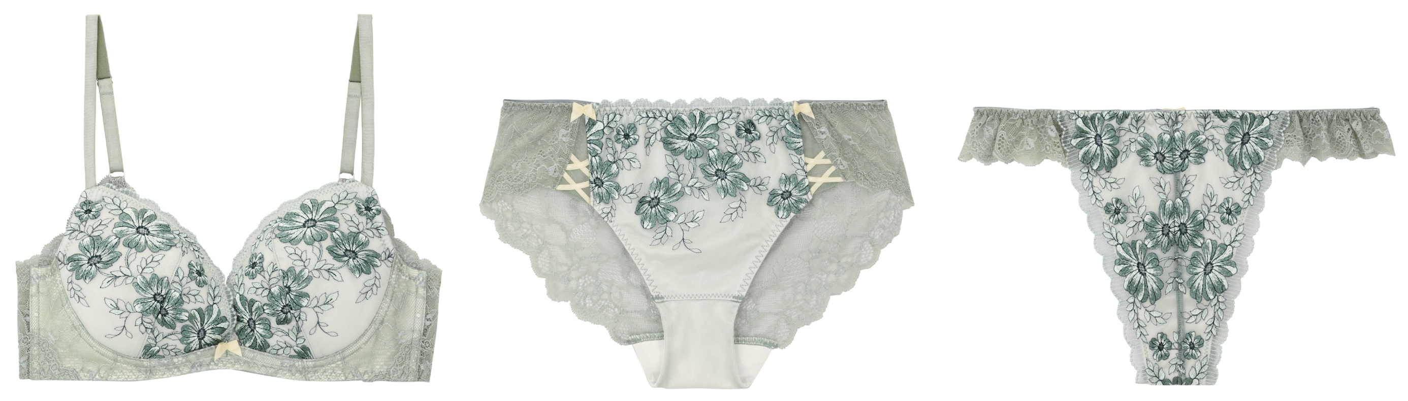 花々の香りを感じさせるエンブロイダリーレースは、美しく咲くガーベラをモチーフに。3色のグリーンをミックスして創られたダスティミントのレースは、セルフヒーリング・幸せや安らぎ・わたしらしさという思いを込めて。繊細なドットのスカラップが、控えめながらデコルテを華やかに飾ります。アクセントになるのは中心の小さなリボン。光が差し込んだような優しいイエローが、さり気ないポイントです。癒しと落ち着きをもたらす花々に、わたしの愛のメッセージを込めて。