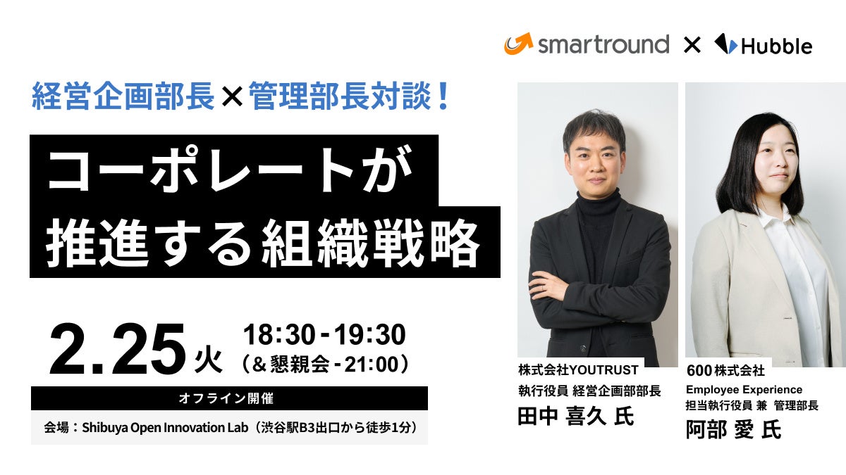法務と事業部門の協業性を高める契約業務・管理クラウドサービス「Hubble(ハブル)」を提供する株式会社Hubble(東京都渋谷区、CEO:早川晋平)は、2025年2月25日(火) 18:30-21:00にて、株式会社YOUTRUST 執行役員 経営企画部部長 田中 喜久 氏、600株式会社 Employee Experience 担当執行役員 兼 管理部長 阿部 愛氏をお迎えし、「経営企画部長×管理部長対談!コーポレートが推進する組織戦略」と題したイベントを株式会社スマートラウンドと共同で開催いたします。本イベントはオフライン開催・事前登録制です。