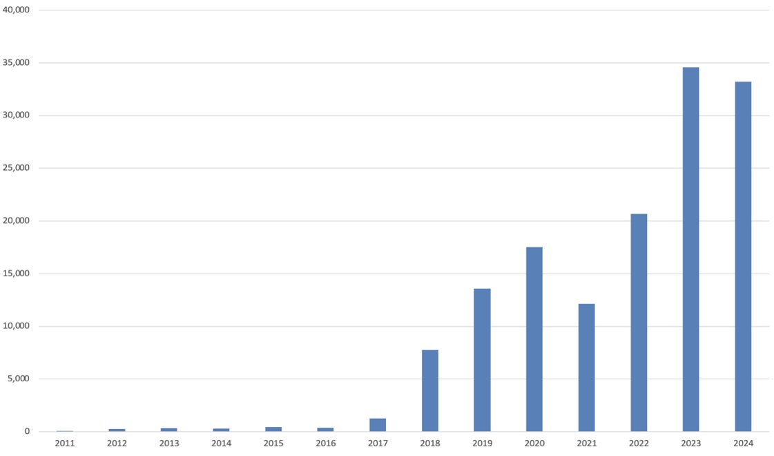 TRANBIは2011年に日本で最初のM&Aプラットフォームを立ち上げ、ユーザー数を増加させ後継者不在事業を中心とした事業や会社を譲渡したい企業(以下、「売り手」という)の案件を掲載し、譲受希望者(以下、「買い手」という)とのオンラインマッチングを支援してまいりました。この度2025年3月期(2024年4月〜2025年3月)における成約件数が529件と前年度実績の343件の約1.5倍増加いたしました(図①)。