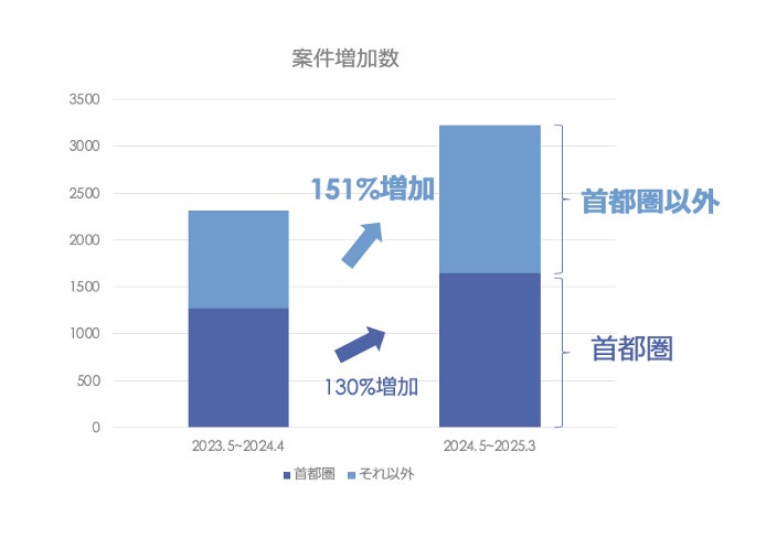 その結果、2023年5月〜2024年4月の1年間と、2024年5月〜2025年4月の1年間で比較すると、全国の売却案件数が約140%ほどの増加し3222件となりましたが、首都圏と首都圏以外の案件数について比較すると首都圏は130%増加に対して首都圏以外は151%増加しました(図③)。つまり、この1年間でTRANBIのご利用が全国的に広がってきていることが伺えます。
