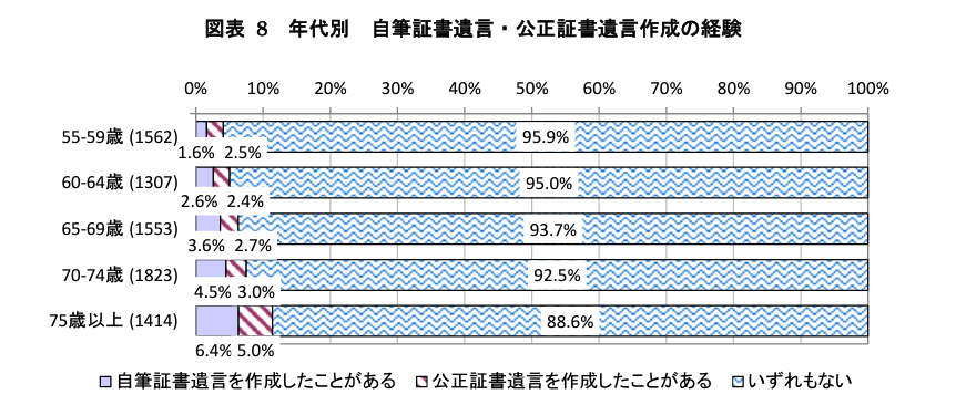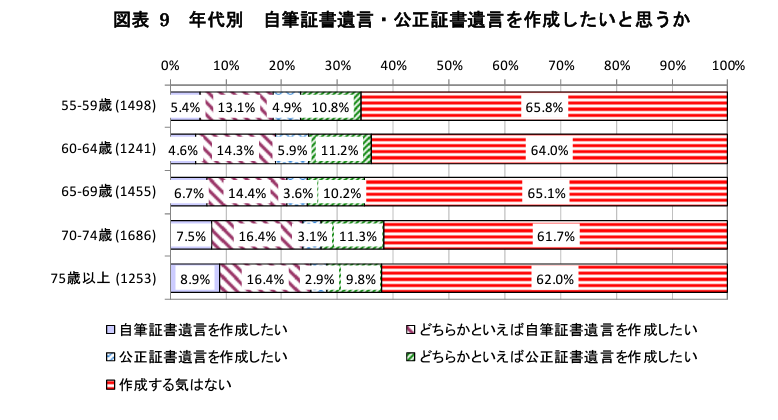 そのため、55歳以上を対象とした法務省による調査対象者へのアンケート結果(*)では、「遺言書を作成したいと思うか」との質問に、すべての年代で約4割が前向きな回答をしているにも関わらず、実際に遺言書を作成した人の割合は、75歳以上でも10.4%にとどまっています。