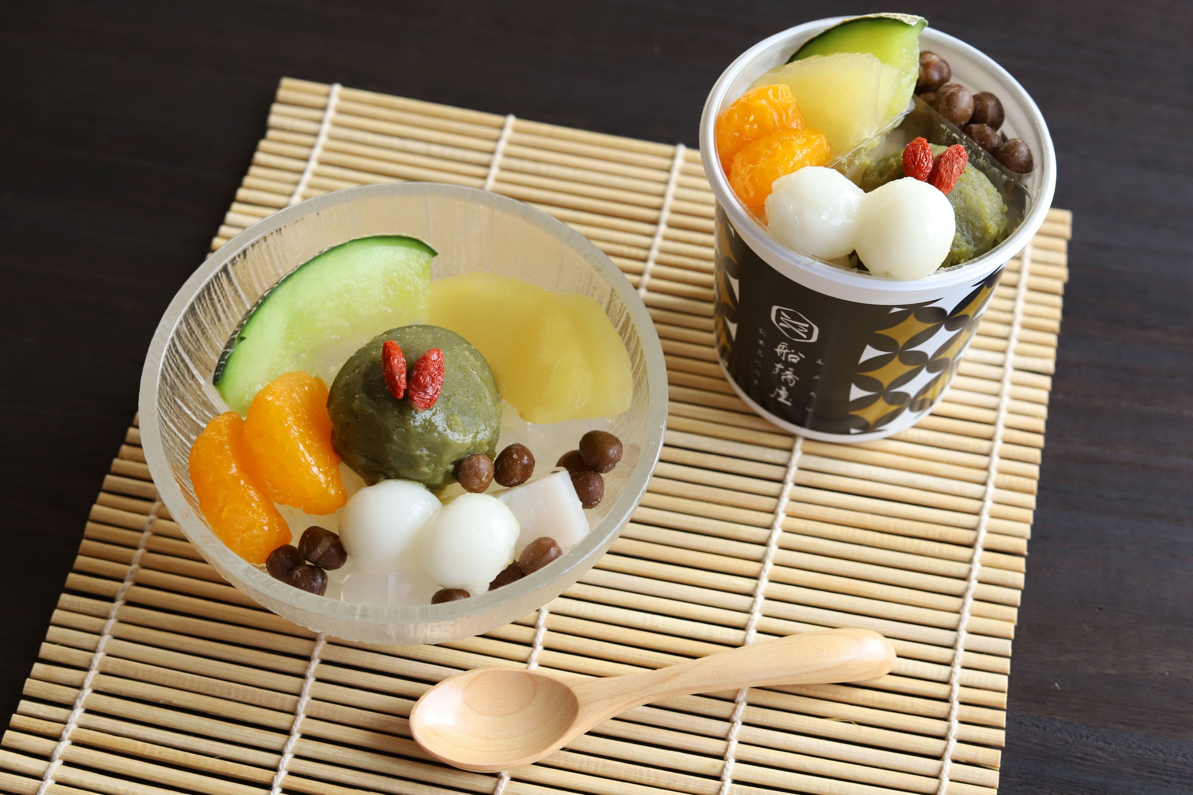 濃厚なお抹茶餡に旬のメロンやみかん、林檎の蜜煮を合わせました。船橋屋の看板商品であるくず餅や白玉入りで贅沢感をプラス。自家製のコク深い黒蜜をかけてお召し上がりください。