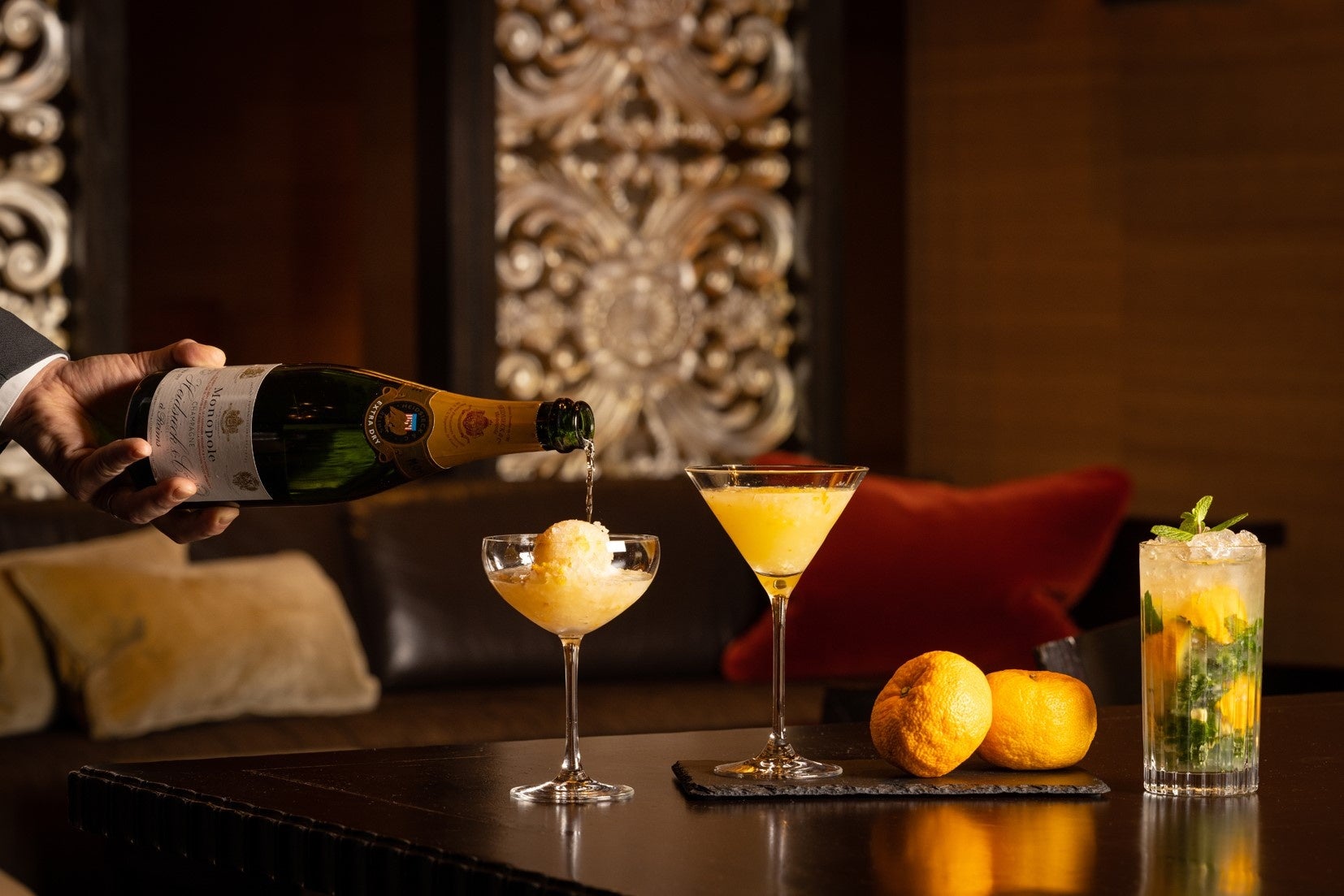 大人のためのシックなジャズ ラウンジ「マデュロ」では、徳島県産の柚子をつかった3種類のオリジナルカクテルをご用意いたします。フレッシュミントの葉の部分だけをたっぷりと入れてつくる「マデュロ」のシグネチャーカクテル「モヒート」や、辛口リキュールのウォッカでつくるマティーニ、柚子を皮ごとつかった自家製ソルベにシャンパンを注ぐシャンパンソルベ、3種のカクテルはどれも柚子の爽やかな香りと酸味をお楽しみいただける、すっきりとした口当たりに仕上げます。海外アーティストによるライブミュージックとともに、贅沢な大人の夜のひとときをお過ごしください。