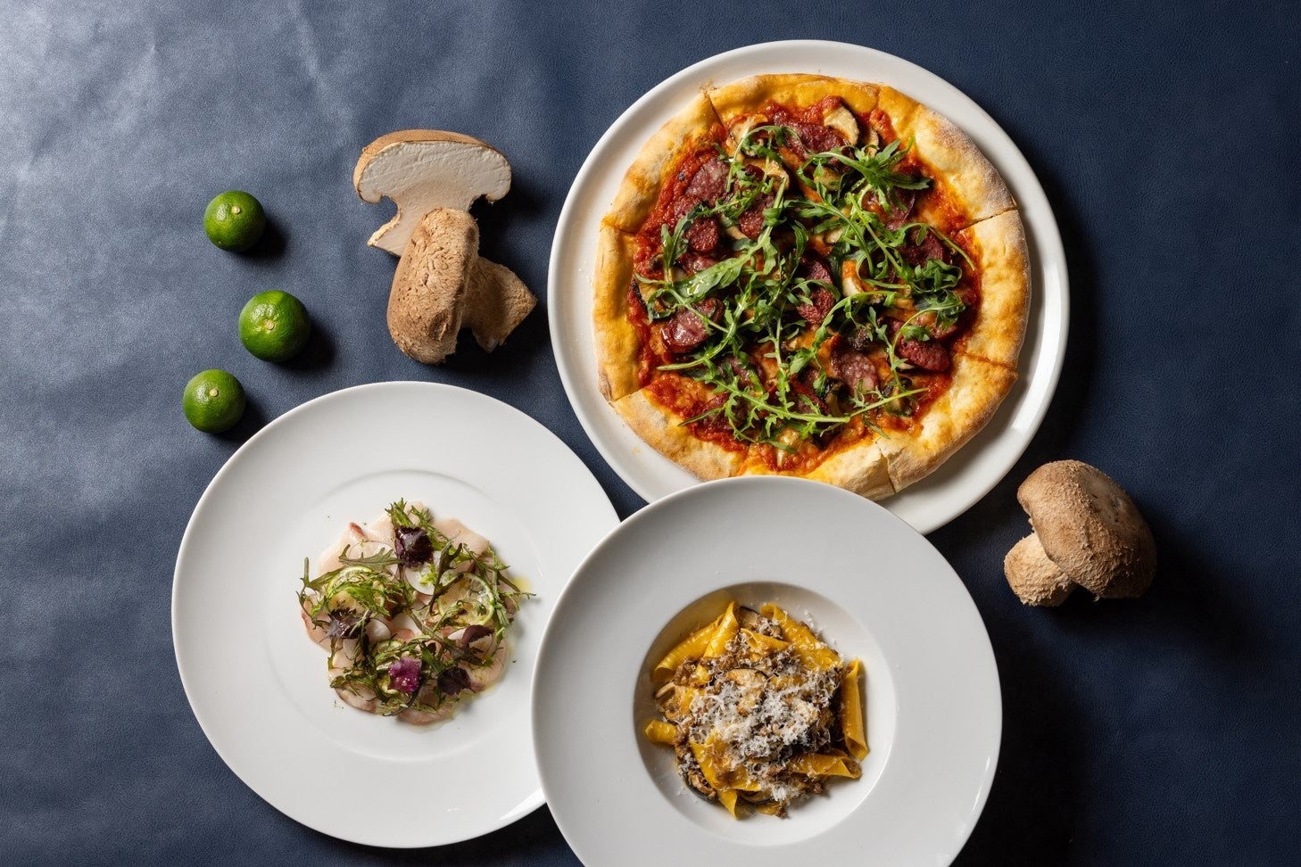 オーセンティックかつ旬の素材を活かしたイタリア各地のお料理をお楽しみいただけるモダンなイタリアン カフェ「フィオレンティーナ」では、ジビエ(鹿肉)のラグーと天恵菇を、手作業で丸める自家製ガルガネッリと合わせたパスタや、鹿肉のソーセージと天恵菇のピザの2種のプリモピアットをご用意いたします。加えて、身が引き締まりビタミンEが豊富な「すだちぶり」をすだちとともにさっぱりとお召し上がりいただけるカルパッチョの計3品がお楽しみいただけます。