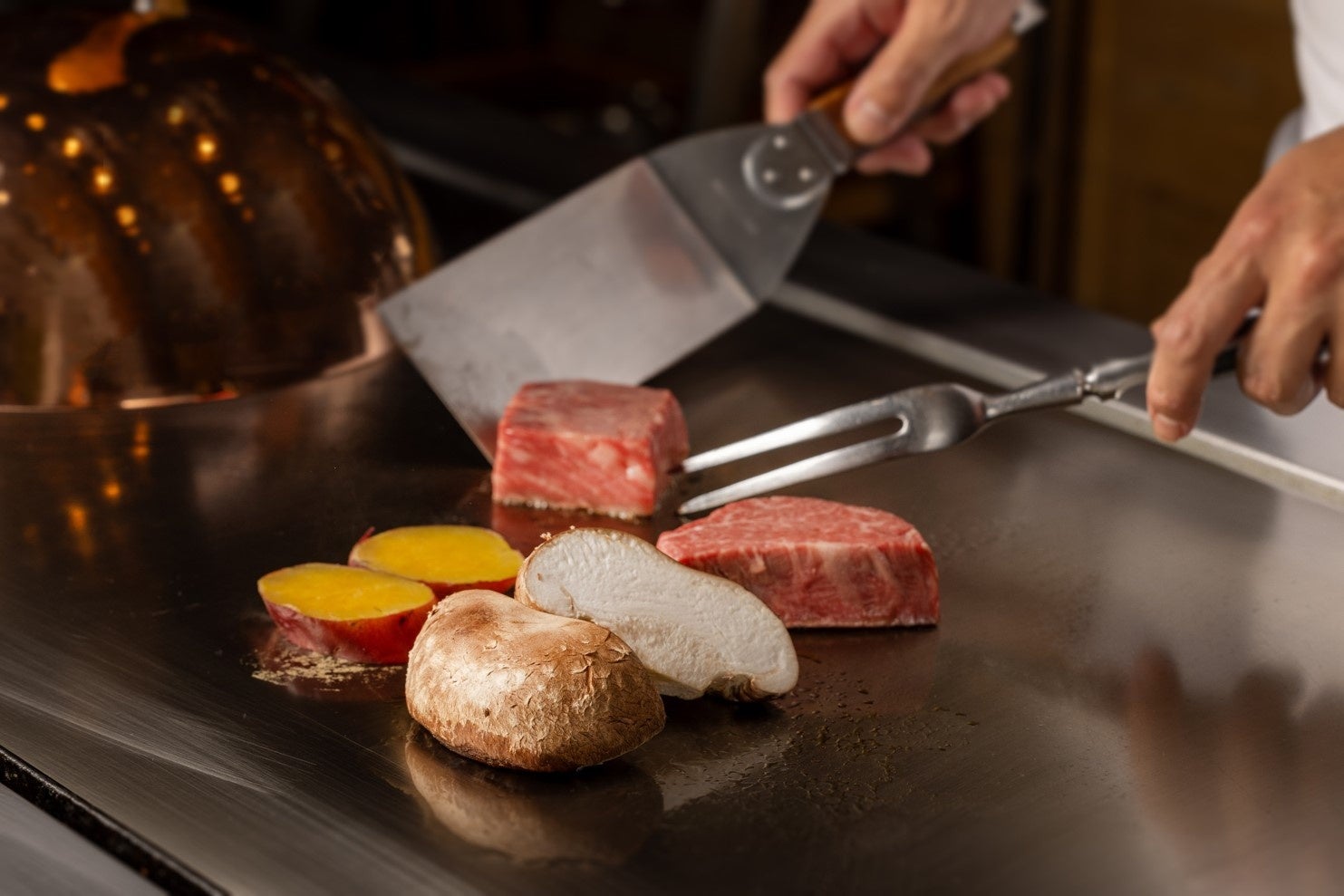 産地を厳選し旬にこだわった新鮮な食材をライブ感あふれる鉄板焼でお召し上がりいただける「けやき坂」では、アニマルウェルフェアや生物多様性と環境保全、飼料の管理などさまざまな要件を満たし「JGAP牧場」に認定された農場で大切に育てられた、徳島県により「安心・安全」「美味しさ」など独自の基準を満たした特別な牛肉「とくしま三ツ星ビーフ」と認定されたサーロインやテンダーロインがお楽しみいただけます。また、トリュフ香る包み焼きでご用意する「すだちぶり」などをご用意いたします。