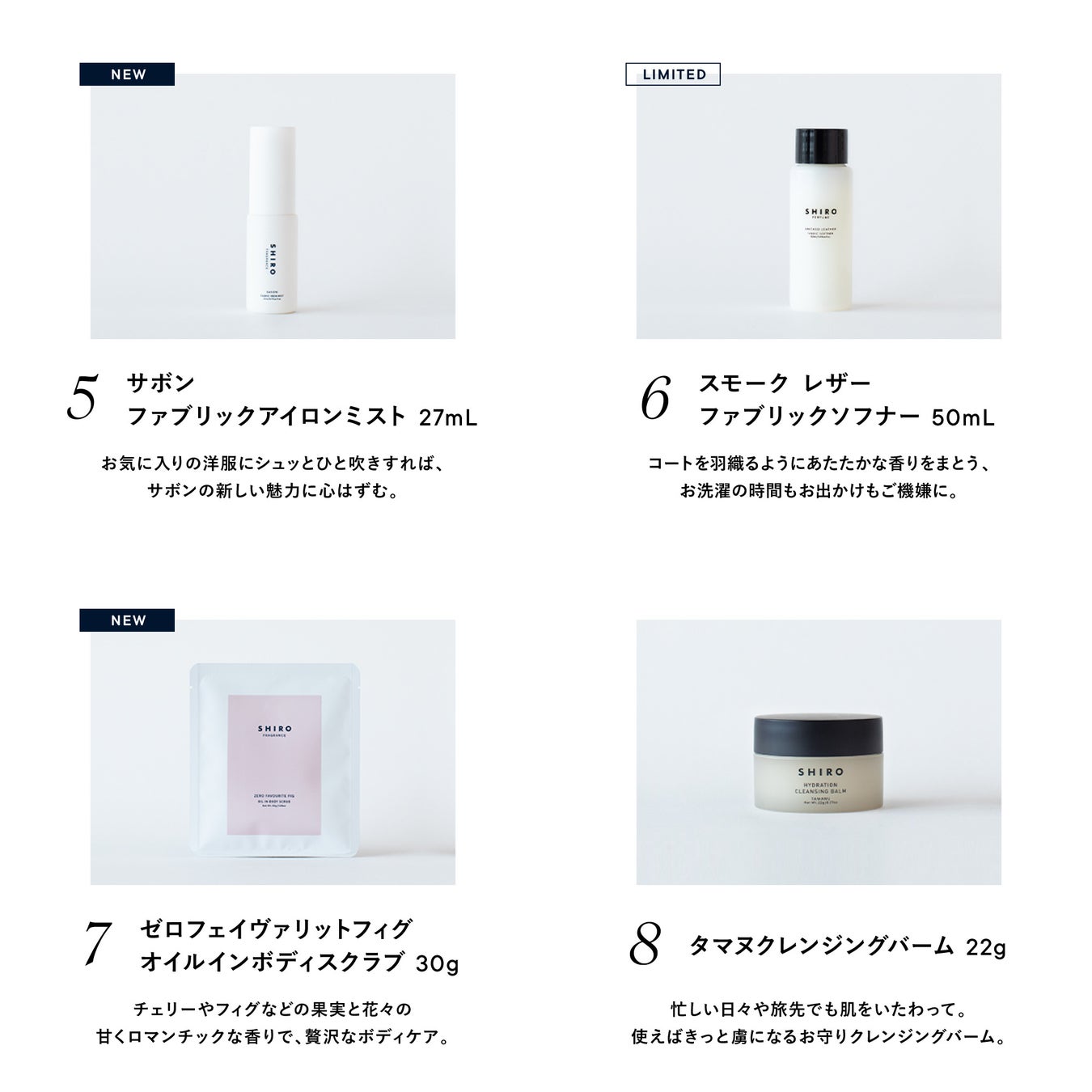 2024/11/16(土) SHIRO Membership Program 「FAST RESERVE(会員向け先行予約)」開始 2024/11/18(月) SHIRO 全国直営店舗にて予約開始 2024/11/21(木) SHIRO オンラインストア(午前10時)、SHIRO全国直営店舗にて発売 |