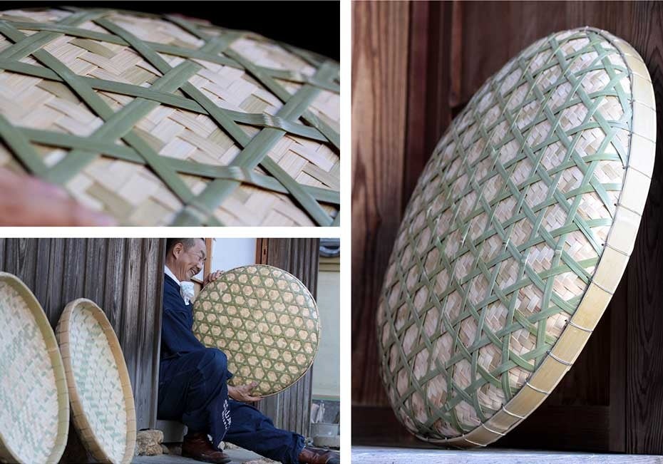 本品は、国産孟宗竹と真竹を贅沢に使い、網代編みの底にさらに六ツ目編みの補強を施した“二重”構造で、梅干しや干し野菜をしっかり支える堅牢さが特長です。直径約60cmという大きめサイズは、土用干しなどにも最適。竹ヒゴが織り成す美しい網代模様は、経年変化で味わい深い表情に成長します。
