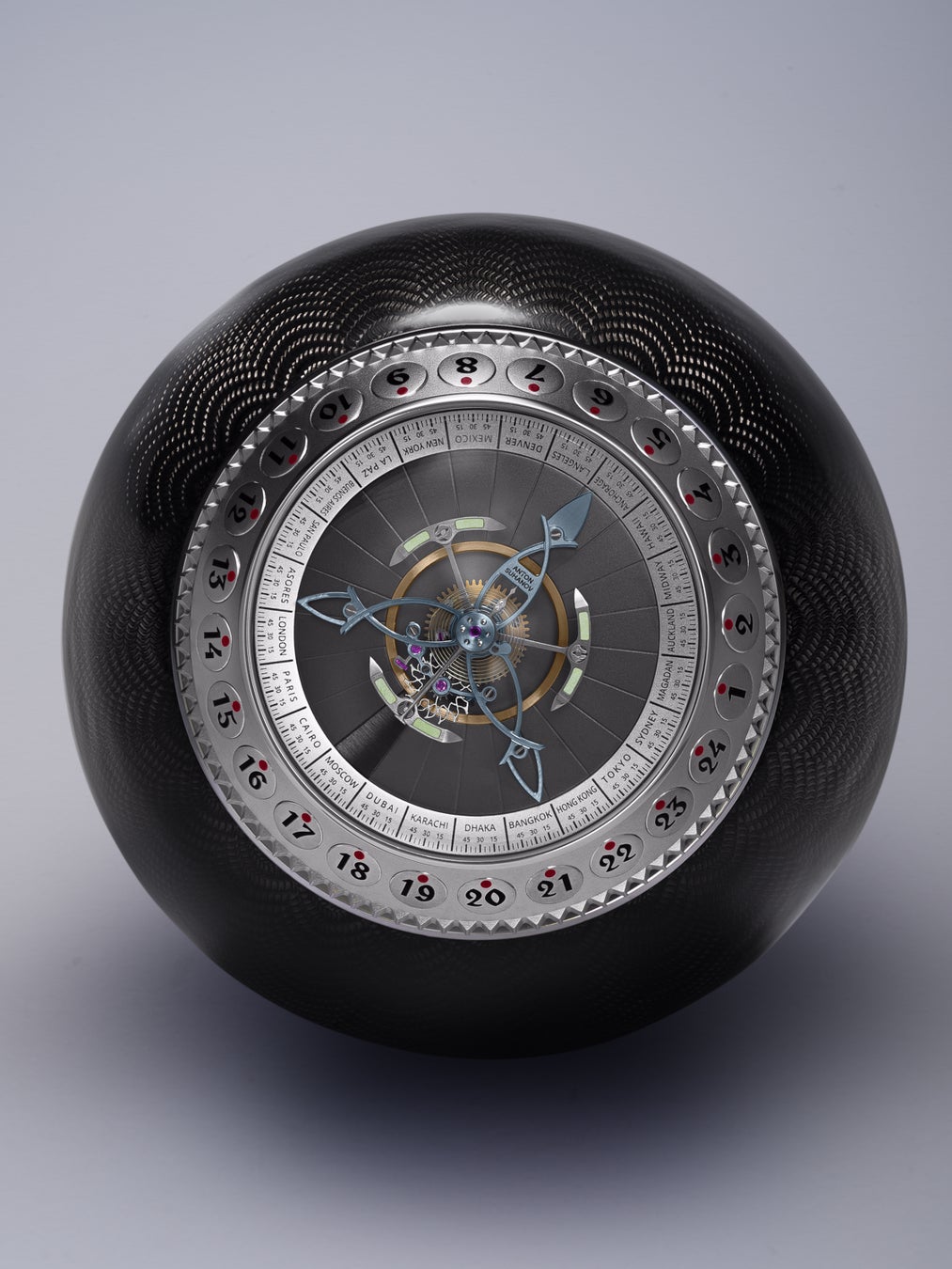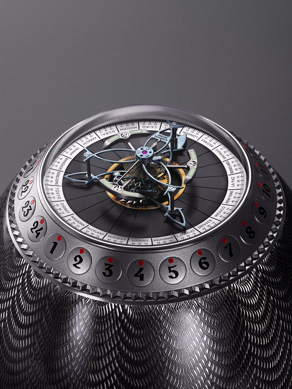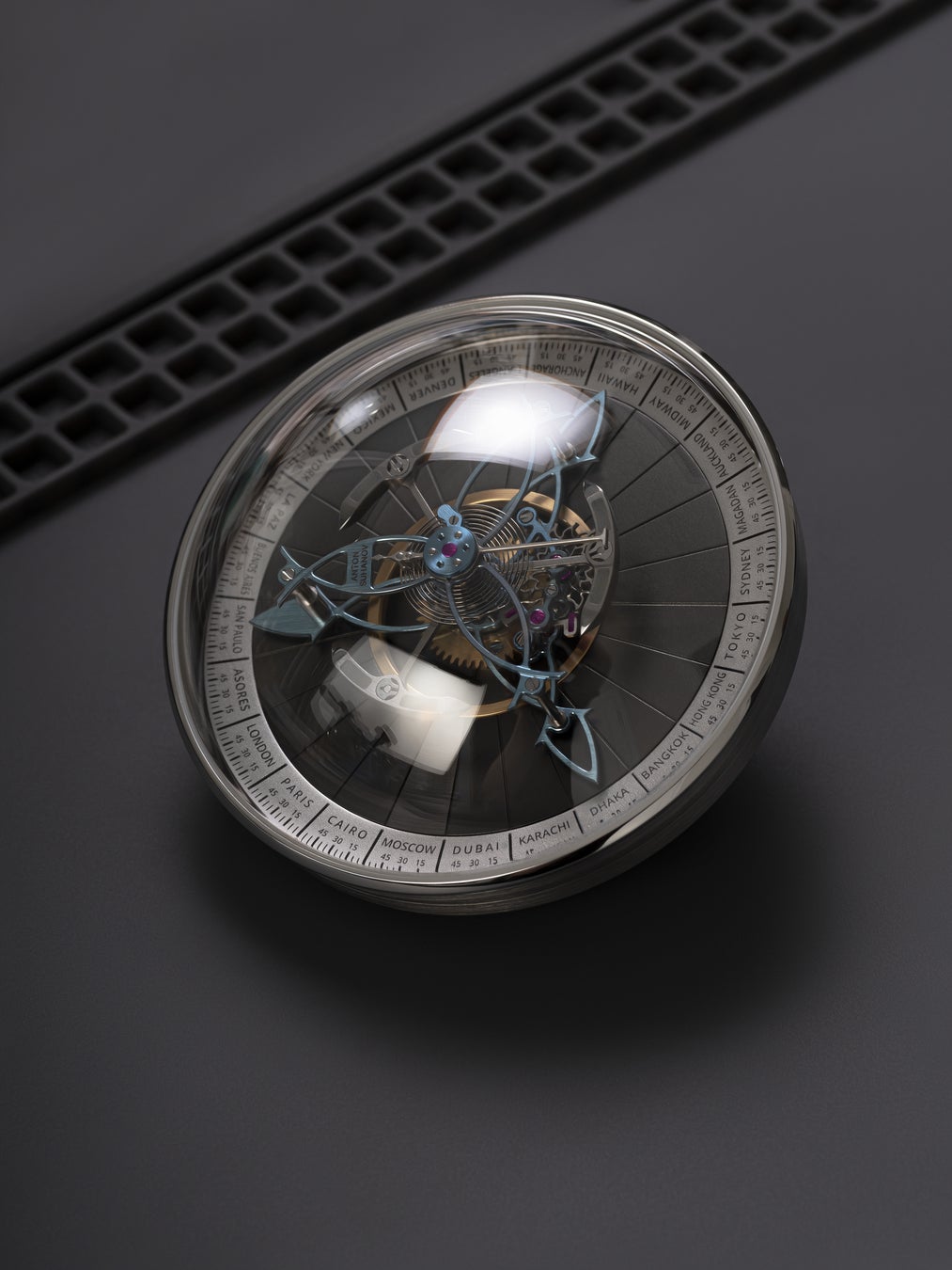 このベゼルは、世界24のタイムゾーンすべての時刻設定を担うと同時に、1回転24秒で回転するフライング・トゥールビヨンの「秒」表示としても機能します。