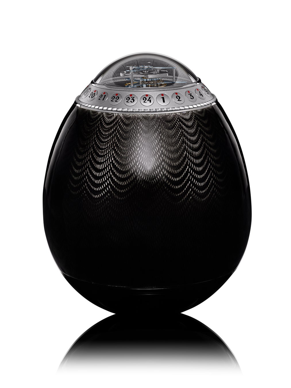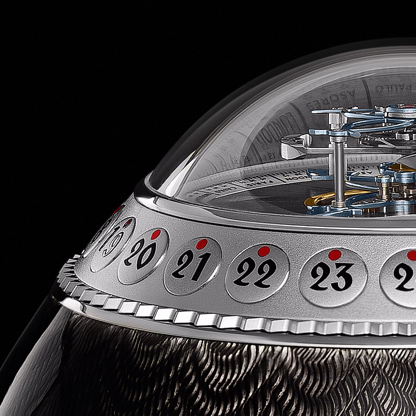 ミラーポリッシュ仕上げのステンレススチール製ベース、その上に手彫りギョーシェと半透明のホットエナメルで装飾されたシルバー製ケース、トゥールビヨンと時刻表示を覆うドーム型サファイアクリスタルという、3つの主要パートで構成されています。