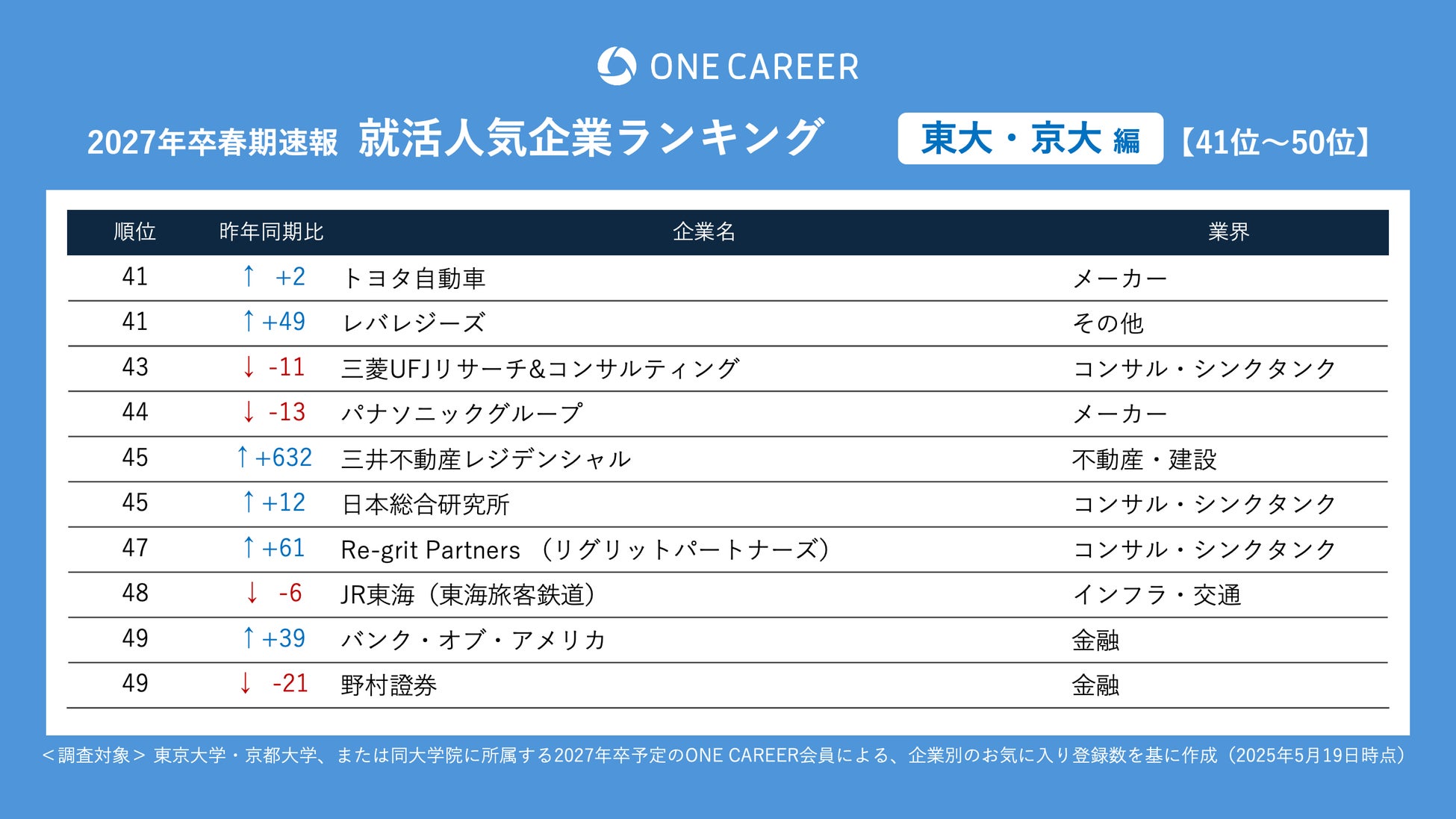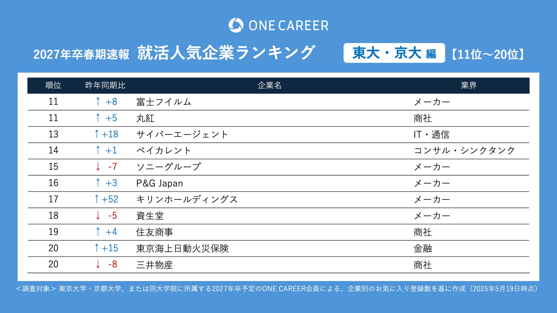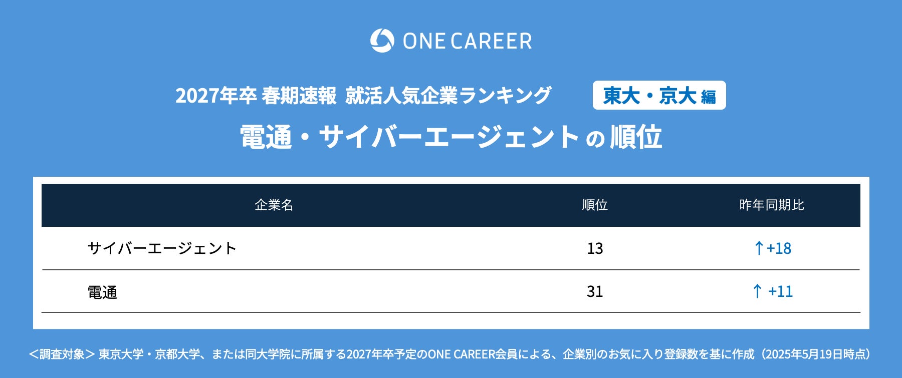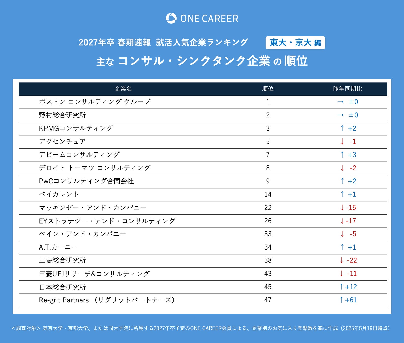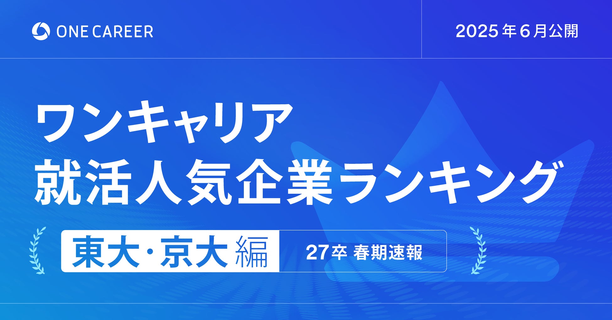 “はじめてのキャリアを選ぶ、就活サイト”「ONE CAREER」を運営する株式会社ワンキャリア(本社:東京都渋谷区、代表取締役社長 執行役員CEO:宮下 尚之、以下「ワンキャリア」)は、「ONE CAREER」のユーザーで、東京大学・京都大学に在籍する2027年3月卒業見込みの大学3年生・大学院1年生を対象に調査した「ワンキャリア就活人気企業ランキング【東大・京大編】27卒春期速報」を発表しました。