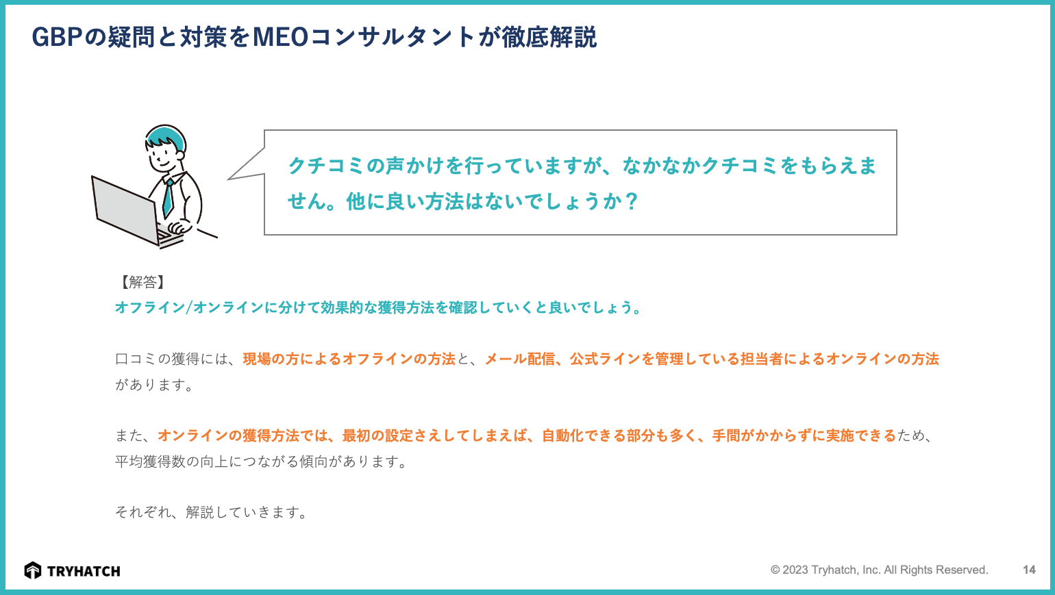 トライハッチのMEOコンサルタントが、MEO対策に関する疑問点についてレポート内で詳細に回答しています。