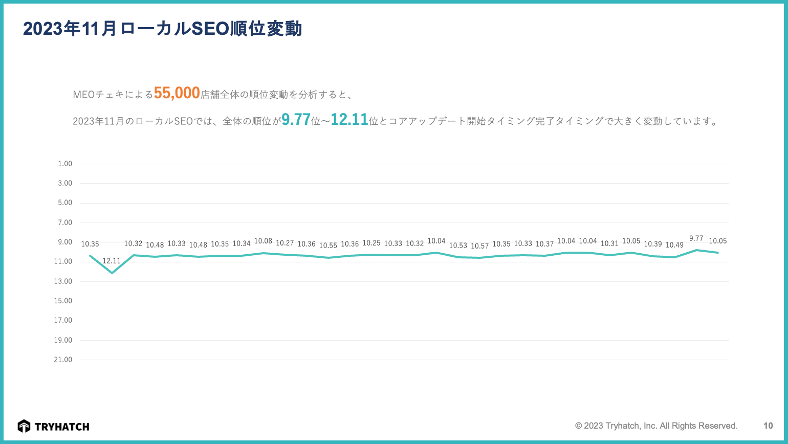 2023年11月のローカルSEOでは、全体の順位が9.77位〜12.11位とコアアップデート展開日前後、展開完了後前後で大きな変動が発生しています。