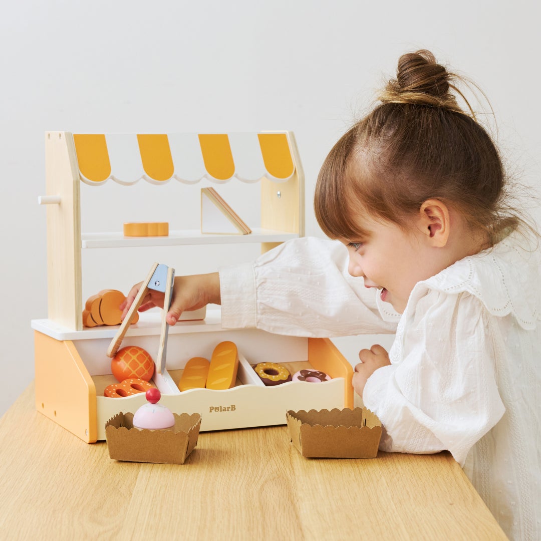パンやスイーツがたっぷり14個付いた、パンやさんのおもちゃ。オーブンでパンを焼いて、トングを使ってお店に並べて、バスケットに入れたら「はいどうぞ!」お友だちや家族と一緒に遊ぶことでコミュニケーションが広がります。野菜などのお手持ちのアイテムと組み合わせれば、マルシェとして遊びが発展。大きくなったらアクセサリーなどの小物ラックとして使うこともでき、長くお楽しみいただけます。